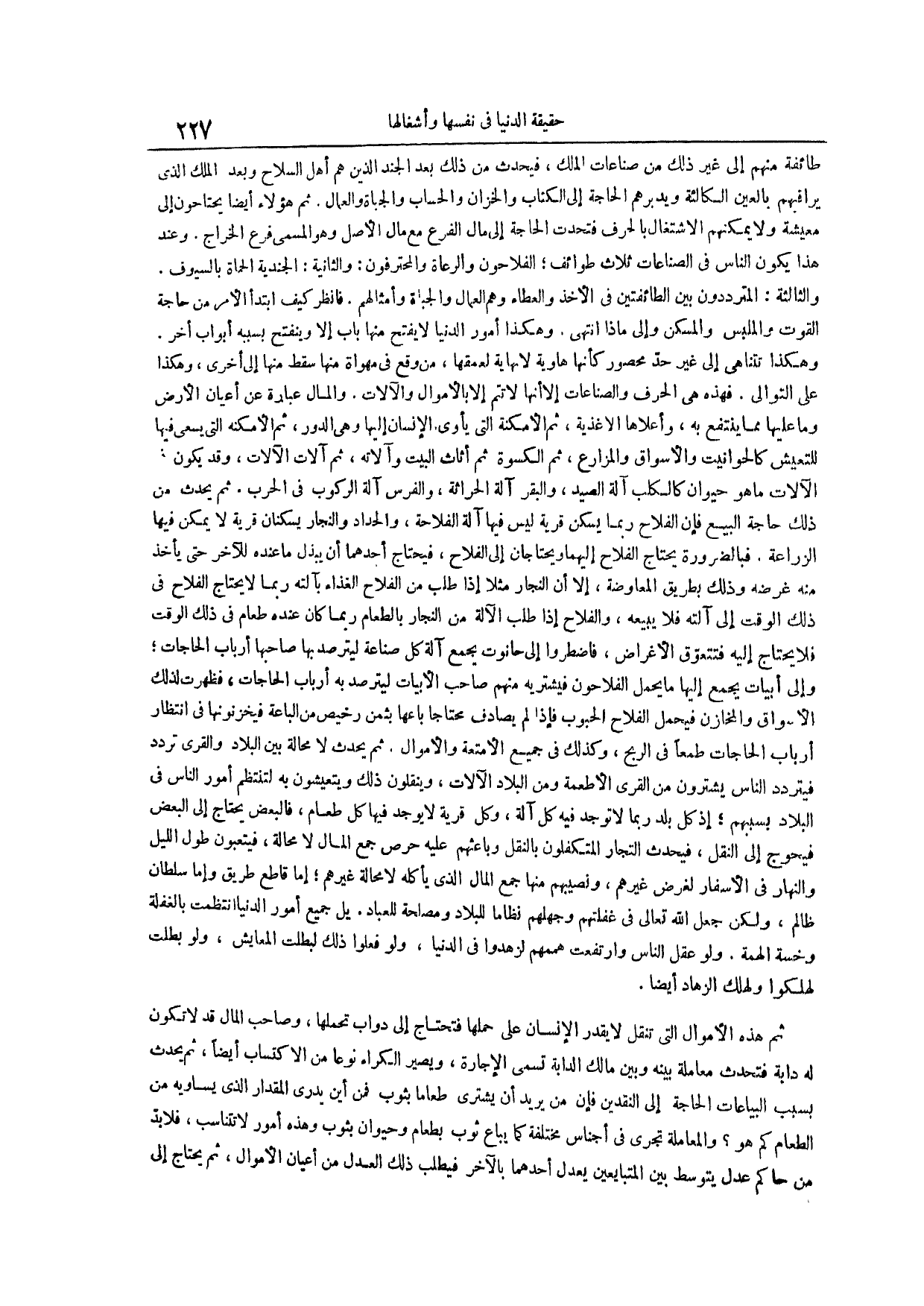 وهكذا أمور الدنيا لا يفتح منها باب إلا وينفتح بسببه أبواب أخر وهكذا تتناهى إلى غير حد محصور كأنها هاوية لا نهاية لعمقها من وقع في مهواة منها سقط منها إلى أخرى وهكذا على التوالي فهذه هي الحرف والصناعات إلا أنها لا تتم إلا بالأموال والآلات والمال عبارة عن أعيان الأرض وما عليها مما ينتفع به وأعلاها الأغذية ثم الأمكنة التي يأوي الإنسان إليها وهي الدور ثم الأمكنة التي يسعى فيها للتعيش كالحوانيت والأسواق والمزارع ثم الكسوة ثم أثاث البيت وآلاته ثم آلات الآلات وقد يكون الآلات ما هو حيوان كالكلب آلة الصيد والبقر آلة الحراثة والفرس آلة الركوب في الحرب ثم يحدث من ذلك حاجة البيع فإن الفلاح ربما يسكن قرية ليس فيها آلة الفلاحة والحداد والنجار يسكنان قرية لا يمكن فيها الزراعة فبالضرورة يحتاج الفلاح إليهما ويحتاجان إلى الفلاح فيحتاج أحدهما أن يبذل ما عنده للآخر حتى يأخذ منه غرضه وذلك بطريق المعاوضة إلا أن النجار مثلاً إذا طلب من الفلاح الغذاء بآلته ربما لا يحتاج الفلاح في ذلك الوقت إلى آلته فلا يبيعه والفلاح إذا طلب الآلة من النجار بالطعام ربما كان عنده طعام في ذلك الوقت فلا يحتاج إليه فتتعوق الأغراض فاضطروا إلى حانوت يجمع آلة كل صناعة ليترصد بها صاحبها أرباب الحاجات وإلى أبيات يجمع إليها ما يحمل الفلاحون فيشتريه منهم صاحب الأبيات ليترصد به أرباب الحاجات فظهرت لذلك الأسواق والمخازن فيحمل الفلاح الحبوب فإذا لم يصادف محتاجاً باعها بثمن رخيص من الباعة فيخزنونها في انتظار أرباب الحاجات طمعا في الربح وكذلك في جميع الأمتعة والأموال ثم يحدث لا محالة بين البلاد والقرى تردد فيتردد الناس يشترون من القرى الأطعمة ومن البلاد الآلات وينقلون ذلك ويتعيشون به لتنتظم أمور الناس في البلاد بسببهم إذ كل بلد ربما لا توجد فيه كل آلة وكل قرية لا يوجد فيها كل طعام فالبعض يحتاج إلى البعض فيحوج إلى النقل فيحدث التجار المتكفلون بالنقل وباعثهم عليه حرص جمع المال لا محالة فيتعبون طول الليل والنهار في الأسفار لغرض غيرهم ونصيبهم منها جمع المال الذي يأكله لا محالة غيرهم إما قاطع طريق وإما سلطان ظالم ولكن جعل الله تعالى في غفلتهم وجهلهم نظاماً للبلاد ومصلحة للعباد بل جميع أمور الدنيا انتظمت بالغفلة وخسة الهمة