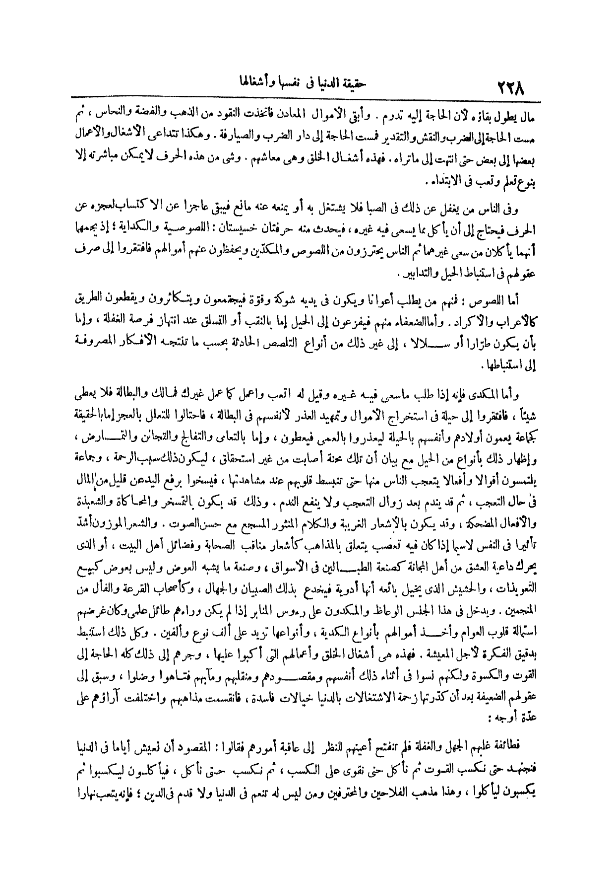 وأبقى الأموال المعادن فاتخذت النقود من الذهب والفضة والنحاس ثم مست الحاجة إلى الضرب والنقش والتقدير فمست الحاجة إلى دار الضرب والصيارفة وهكذا تتداعى الأشغال والأعمال بعضها إلى بعض حتى انتهت إلى ما تراه فهذه أشغال الخلق وهي معاشهم وشي من هذه الحرف لا يمكن مباشرته إلا بنوع تعلم وتعب في الابتداء وفي الناس من يغفل عن ذلك في الصبا فلا يشتغل به أو يمنعه عنه مانع فيبقى عاجز عن الاكتساب لعجزه عن الحرف فيحتاج إلى أن يأكل مما يسعى فيه غيره فيحدث منه حرفتان خسيستان اللصوصية والكداية إذ يجمهما أنهما يأكلان من سعي غيرهما ثم الناس يحترزون من اللصوص والمكدين ويحفظون عنهم أموالهم فافتقروا إلى صرف عقولهم في استنباط الحيل والتدابير أما اللصوص فمنهم من يطلب أعواناً ويكون في يديه شوكة وقوة فيجتمعون ويتكاثرون ويقطعون الطريق كالأعراب والأكراد وأما الضعفاء منهم فيفزعون إلى الحيل إما بالنقب أو التسلق عند انتهاز فرصة الغفلة وإما بأن يكون طراراً أو سلالاً إلى غير ذلك من أنواع التلصص الحادثة بحسب ما تنتجه الأفكار المصروفة إلى استنباطها وأما المكدي فإنه إذا طلب ما سعى فيه غيره وقيل له اتعب واعمل كما عمل غيرك فمالك والبطالة فلا يعطى شيئاً فافتقروا إلى حيلة في استخراج الأموال وتمهيد العذر لأنفسهم في البطالة فاحتالوا للتعلل بالعجز إما بالحقيقة كجماعة يعمون أولادهم وأنفسهم بالحيلة ليعذروا بالعمى فيعطون وإما بالتعامي والتفالج والتجانن والتمارض وإظهار ذلك بأنواع من الحيل مع بيان أن تلك محنة أصابت من غير استحقاق ليكون ذلك سبب الرحمة وجماعة يلتمسون أقوالاً وأفعالاً يتعجب الناس منها حتى تنبسط قلوبهم عند مشاهدتها فيسخوا برفع اليد عن قليل من المال في حال التعجب ثم قد يندم بعد زوال التعجب ولا ينفع الندم وذلك قد يكون بالتمسخر والمحاكاة والشعبذة والأفعال المضحكة وقد يكون بالأشعار الغريبة والكلام المنثور المسجع مع حسن الصوت والشعر الموزون أشد تأثيراً في النفس لا سيما إذا كان فيه تعصب يتعلق بالمذاهب كأشعار مناقب الصحابة وفضائل أهل البيت أو الذي يحرك داعية العشق من أهل المجانة كصنعة الطبالين في الأسواق وصنعة ما يشبه العوض وليس بعوض كبيع التعويذات والحشيش الذي يخيل بائعه أنها أدوية فيخدع بذلك الصبيان والجهال وكأصحاب القرعة والفأل من المنجمين ويدخل في هذا الجنس الوعاظ والمكدون على رءوس المنابر إذا لم يكن وراءهم طائل علمي وكان غرضهم استمالة قلوب العوام وأخذ أموالهم بأنواع الكدية وأنواعها تزيد على ألف نوع وألفين وكل ذلك استنبط بدقيق الفكرة لأجل المعيشة فهذه هي أشغال الخلق وأعمالهم التي أكبوا عليها وجرهم إلى ذلك كله الحاجة إلى القوت والكسوة ولكنهم نسوا في أثناء ذلك أنفسهم ومقصودهم ومنقلبهم ومآبهم فتاهوا وضلوا وسبق إلى عقولهم الضعيفة بعد أن كدرتها زحمة الاشتغالات بالدنيا خيالات فاسدة فانقسمت مذاهبهم واختلفت آراؤهم على عدة أوجه