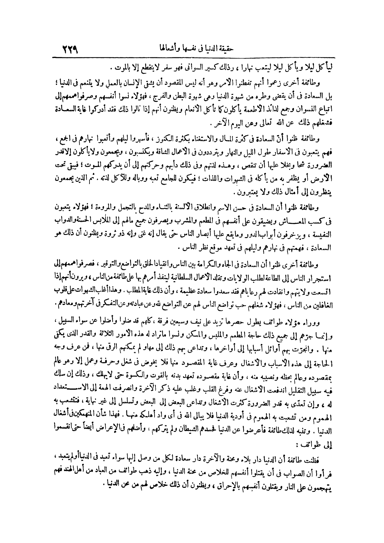 وطائفة أخرى ظنوا أن السعادة في الجاه والكرامة بين الناس وانقياد الخلق بالتواضع والتوقير فصرفوا هممهم إلى استجرار الناس إلى الطاعة لطلب الولايات وتقلد الأعمال السلطانية لينفذ أمرهم بها على طائفة من الناس ويرون أنهم إذا اتسعت ولايتهم وانقادت لهم رعاياهم فقد سعدوا سعادة عظيمة وأن ذلك غاية المطلب وهذا أغلب الشهوات على قلوب الغافلين من الناس فهؤلاء شغلهم حب تواضع الناس لهم عن التواضع لله وعن عبادته وعن التفكر في آخرتهم ومعادهم ووراء هؤلاء طوائف يطول حصرها تزيد على نيف وسبعين فرقة كلهم قد ضلوا وأضلوا عن سواء السبيل وإنما جرهم إلى جميع ذلك حاجة المطعم والملبس والمسكن ونسوا ما تراد له هذه الأمور الثلاثة والقدر الذي يكفي منها وانجرت بهم أوائل أسبابها إلى أواخرها وتداعى بهم ذلك إلى مهاو لم يمكنهم الرقي منها فمن عرف وجه الحاجة إلى هذه الأسباب والأشغال وعرف غاية المقصود منها فلا يخوض في شغل وحرفة وعمل إلا وهو عالم بمقصوده وعالم بحظه ونصيبه منه وأن غاية مقصوده تعهد بدنه بالقوت والكسوة حتى لا يهلك وذلك إن سلك فيه سبيل التقليل اندفعت الأشغال عنه وفرغ القلب وغلب عليه ذكر الآخرة وانصرفت الهمة إلى الاستعداد له وإن تعدى به قدر الضرورة كثرت الأشغال وتداعى البعض إلى البعض وتسلسل إلى غير نهاية فتتشعب به الهموم ومن تشعبت به الهموم في أودية الدنيا فلا يبالي الله في أي واد أهلكه منها فهذا شأن المنهمكين في أشغال الدنيا وتنبه لذلك طائفة فأعرضوا عن الدنيا فحسدهم الشيطان ولم يتركهم وأضلهم في الإعراض أيضاً حتى انقسموا إلى طوائف