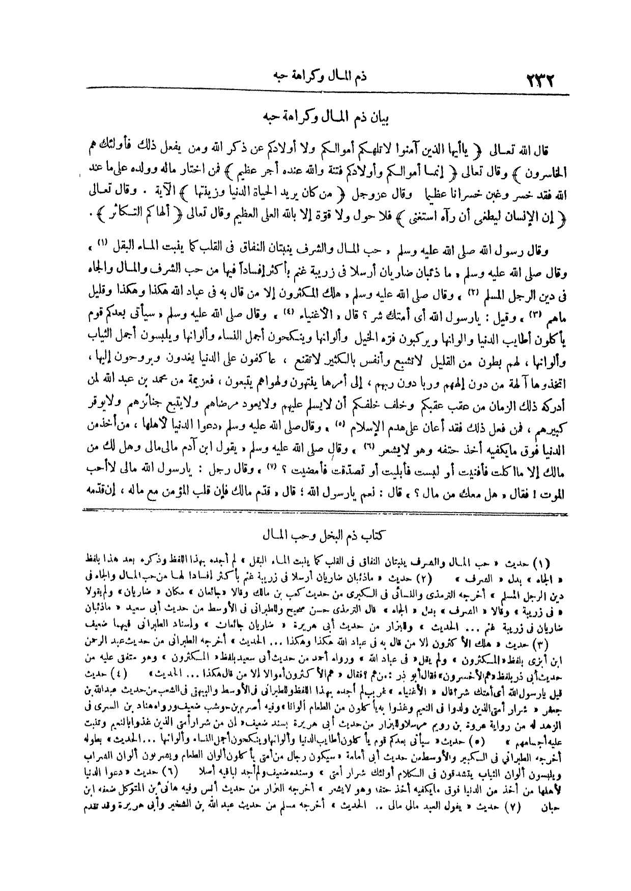 قَالَ اللَّهُ تَعَالَى يَا أَيُّهَا الَّذِينَ آمَنُوا لَا تُلْهِكُمْ أَمْوَالُكُمْ وَلَا أَوْلَادُكُمْ عَنْ ذِكْرِ اللَّهِ وَمَنْ يفعل ذلك فأولئك هم الخاسرون وَقَالَ تَعَالَى إِنَّمَا أَمْوَالُكُمْ وَأَوْلَادُكُمْ فِتْنَةٌ وَاللَّهُ عنده أجر عظيم فَمَنِ اخْتَارَ مَالَهُ وَوَلَدَهُ عَلَى مَا عِنْدَ الله فقد خسر وغبن خسراناً عظيماً وَقَالَ عَزَّ وَجَلَّ مَنْ كَانَ يُرِيدُ الْحَيَاةَ الدنيا وزينتها الآية وقال تعالى إن الإنسان ليطغى أن رآه استغنى فَلَا حَوْلَ وَلَا قُوَّةَ إِلَّا بِاللَّهِ الْعَلِيِّ العظيم وقال تعالى ألهاكم التكاثر وَقَالَ رَسُولُ اللَّهِ صَلَّى اللَّهُ عَلَيْهِ وَسَلَّمَ حب المال والشرف ينبتان النفاق في القلب كما ينبت الماء البقل (¬1)