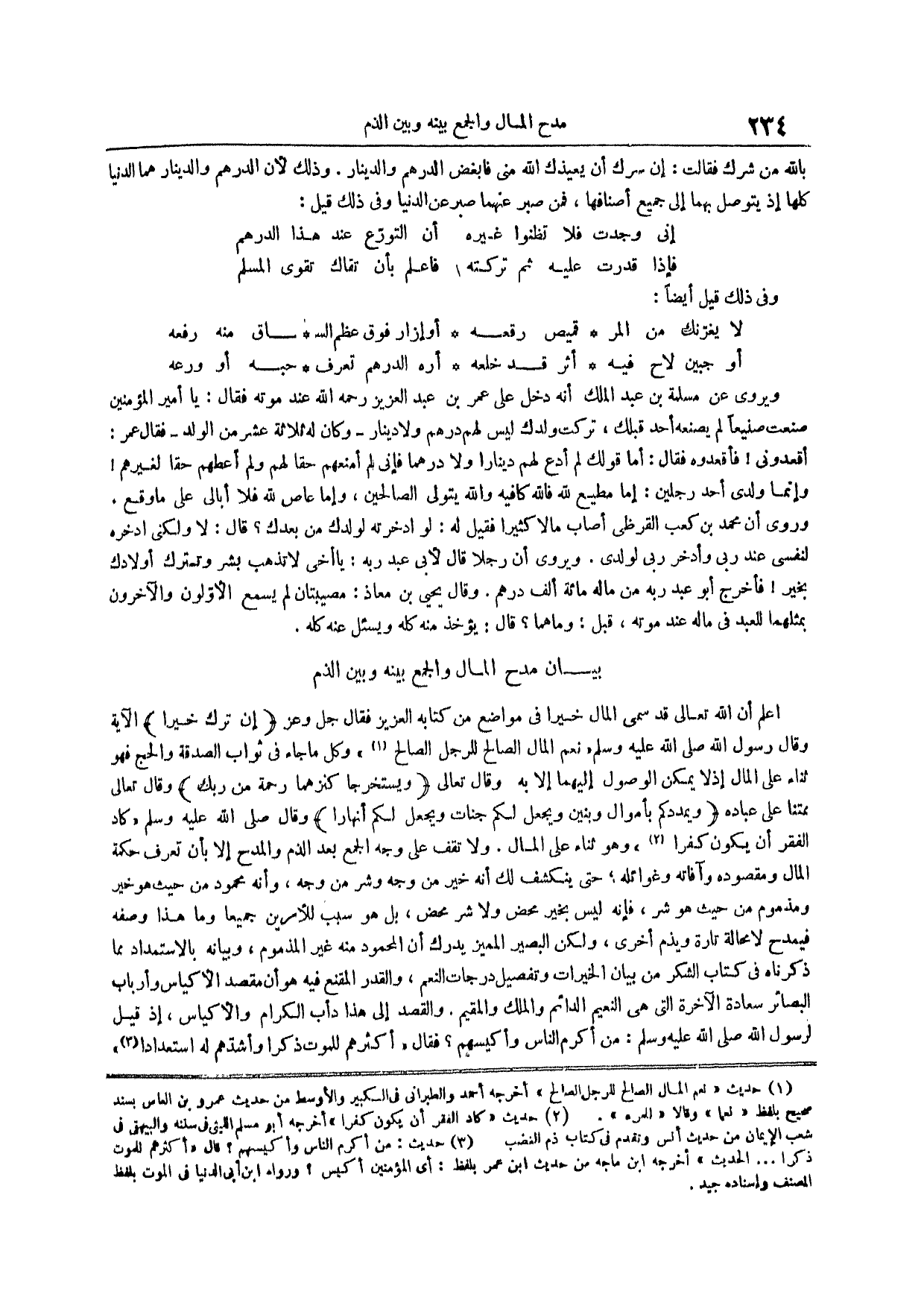 اعْلَمْ أَنَّ اللَّهَ تَعَالَى قَدْ سَمَّى الْمَالَ خَيْرًا فِي مَوَاضِعَ مِنْ كِتَابِهِ العزيز فقال جل وعز {إن ترك خيراً} الآية وَقَالَ رَسُولُ اللَّهِ صَلَّى اللَّهُ عَلَيْهِ وَسَلَّمَ نعم المال الصالح للرجل الصالح (¬1)