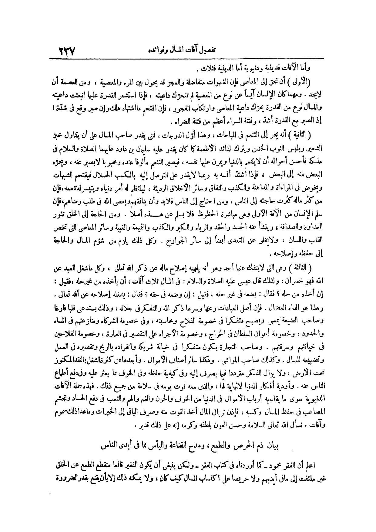 الأولى أن تجر إلى المعاصي فإن الشهوات متفاضلة والعجز قد يحول بين المرء والمعصية ومن العصمة أن لا يجد ومهما كان الإنسان آيساً عن نوع من المعصية لم تتحرك داعيته فإذا استشعر القدرة عليها انبعثت داعيته والمال نوع من القدرة يحرك داعية المعاصي وارتكاب الفجور فإن اقتحم ما اشتهاه هلك وإن صبر وقع في شدة إذ الصبر مع القدرة أشد وفتنة السراء أعظم من فتنة الضراء