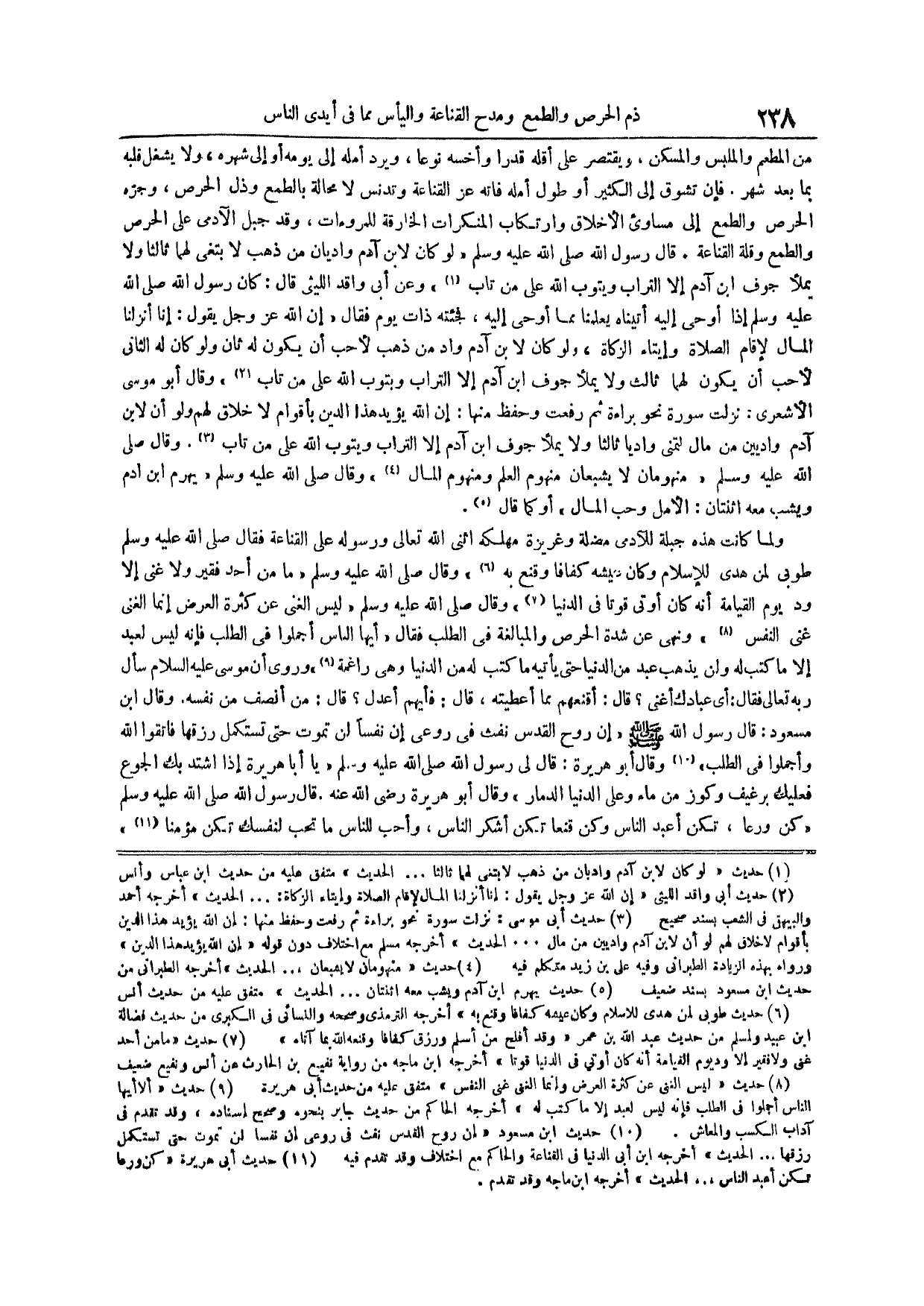 من المطعم والملبس والمسكن ويقتصر على أقله قدراً وأخسه نوعاً ويرد أمله إلى يومه أو إلى شهره ولا يشغل قلبه بما بعد شهر فإن تشوق إلى الكثير أو طول أمله فاته عز القناعة وتدنس لا محالة بالطمع وذل الحرص وجره الحرص والطمع إلى مساوئ الأخلاق وارتكاب المنكرات الخارقة للمروءات وَقَدْ جُبِلَ الْآدَمِيُّ عَلَى الْحِرْصِ وَالطَّمَعِ وَقِلَّةِ الْقَنَاعَةِ قَالَ رَسُولُ اللَّهِ صَلَّى اللَّهُ عَلَيْهِ وَسَلَّمَ لَوْ كَانَ لِابْنِ آدَمَ وَادِيَانِ مِنْ ذهب لابتغى لهما ثالثاً ولا يملأ جوف ابن آدم إلا التراب ويتوب الله على من تاب (¬1) وعن أبي واقد الليثي قال كَانَ رَسُولُ اللَّهِ صَلَّى اللَّهُ عَلَيْهِ وَسَلَّمَ إذا أوحى أليه أتيناه يعلمنا مما أوحى إليه فجئته ذات يوم فقال إن الله عز وجل يقول إنا أنزلنا المال لإقام الصلاة وإيتاء الزكاة ولو كان لابن آدم واد من ذهب لأحب أن يكون له ثان ولو كان له الثاني لأحب أن يكون لهما ثالث ولا يملأ جوف ابن آدم إلا التراب ويتوب الله على من تاب (¬2) وقال أبو موسى الأشعري نزلت سورة نحو براءة ثم رفعت وحفظ منها إن الله يؤيد هذا الدين بأقوام لا خلاق لهم ولو أن لابن آدم واديين من مال لتمنى وادياً ثالثاً ولا يملأ جوف ابن آدم إلا التراب ويتوب الله على من تاب (¬3)