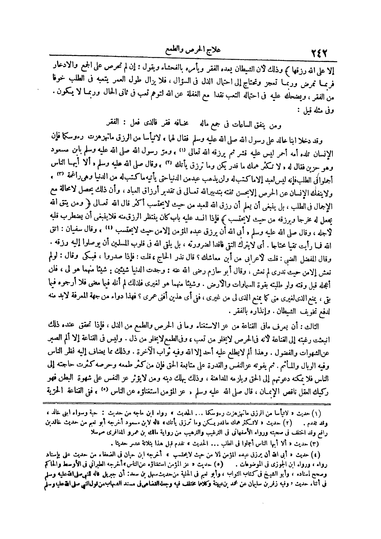 الثالث أن يعرف ما في القناعة من عز الاستغناء وما في الحرص والطمع من الذل فإذا تحقق عنده ذلك انبعثت رغبته إلى القناعة لأنه في الحرص لا يخلو من تعب وفي الطمع لا يخلو من ذل