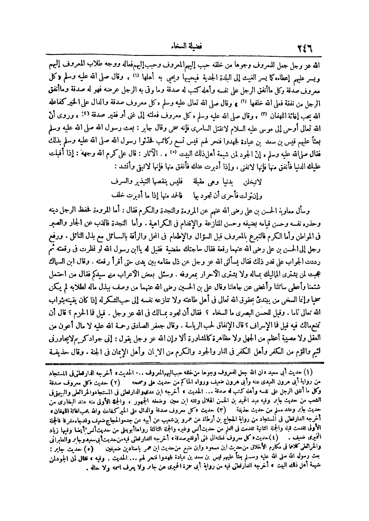 وسأل معاوية الحسن بن علي رضي الله عنهم عن المروءة والنجدة والكرم فقال أما المروءة فحفظ الرجل دينه وحذره نفسه وحسن قيامه بضيفه وحسن المنازعة والأقدام في الكراهية وأما النجدة فالذب عن الجار والصبر في المواطن وأما الكرم فالتبرع بِالْمَعْرُوفِ قَبْلَ السُّؤَالِ وَالْإِطْعَامُ فِي الْمَحَلِّ وَالرَّأْفَةُ بالسائل مع بذل النائل ورفع رجل إلى الحسن بن علي رضي الله عنهما رقعة فقال حاجتك مقضية فقيل له يا ابن رسول الله لو نظرت في رقعته ثم رددت الجواب على قدر ذلك فقال يسألني الله عز وجل عن ذل مقامه بين يدي حتى أقرأ رقعته وقال ابن السماك عجبت لمن يشتري المماليك بماله ولا يشتري الأحرار بمعروفه وسئل بعض الأعراب من سيدكم فقال من احتمل شتمنا وأعطى سائلنا وأغضى عن جاهلنا وقال علي بن الحسين رضي الله عنهما من وصف ببذل ما له لطلابه لم يكن سخياً وإنما السخي من يبتديء بحقوق الله تعالى في أهل طاعته ولا تنازعه نفسه إلى حب الشكر له إذا كان يقينه بثواب الله تعالى تاماً وقيل للحسن البصري ما السخاء فقال أن تجود بمالك في الله عز وجل قيل فما الحزم قال أن تمنع مالك فيه قيل فما الإسراف قال الإنفاق لحب الرياسة