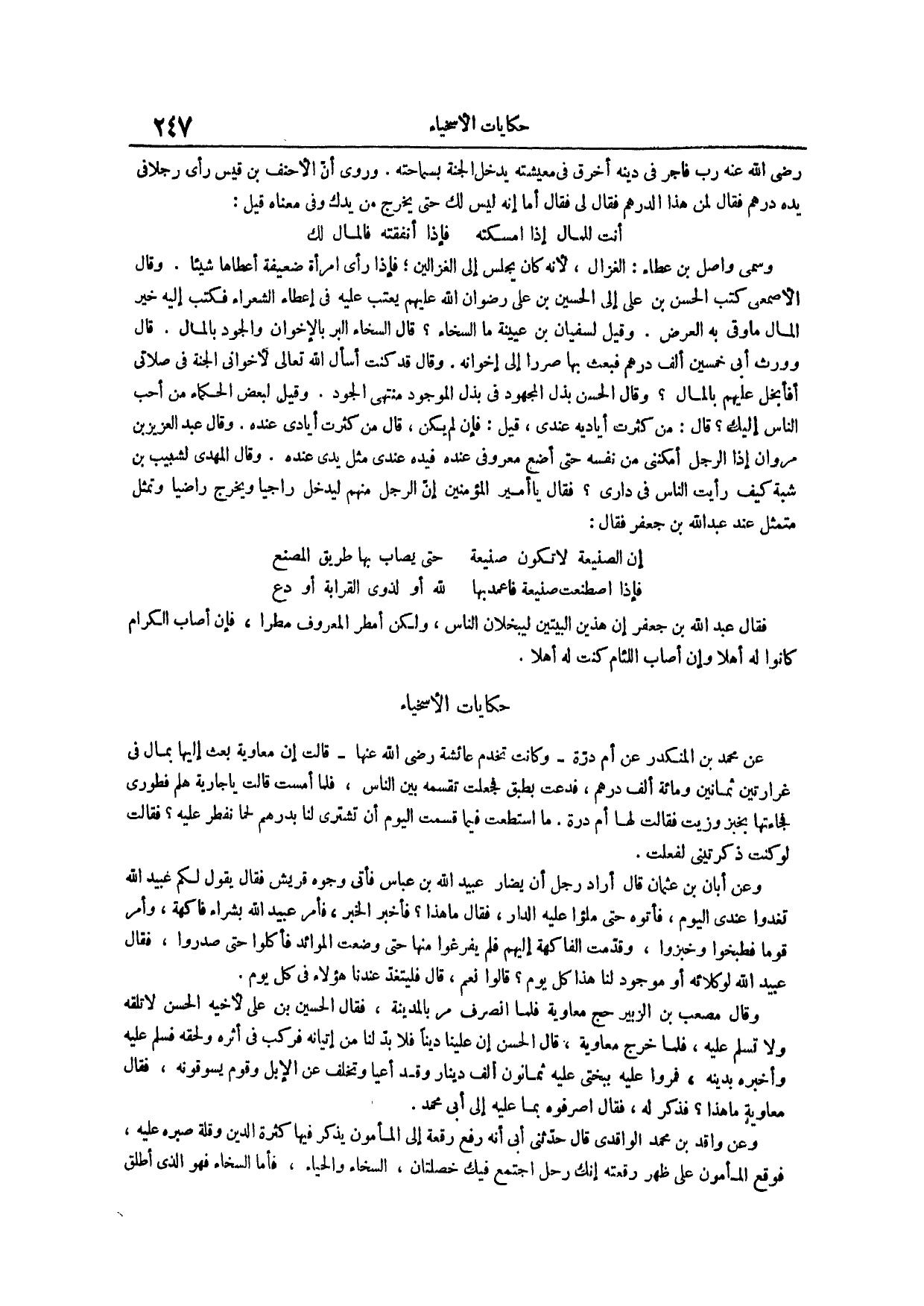 فقال عبد الله بن جعفر إن هذين البيتين ليبخلان الناس ولكن أَمْطِرِ الْمَعْرُوفَ مَطَرًا فَإِنْ أَصَابَ الْكِرَامَ كَانُوا لَهُ أَهْلًا وَإِنْ أَصَابَ اللِّئَامَ كُنْتَ لَهُ أهلاً حكايات الأسخياء