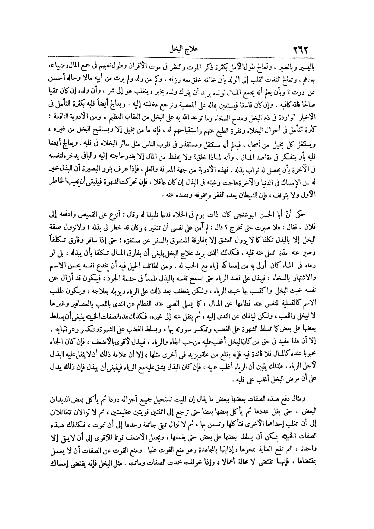 حكي أن أبا الحسن البوشنجي كان ذات يوم في الخلاء فدعا تلميذاً له وقال انزع عني القميص وادفعه إلى فلان فقال هلا صبرت حتى تخرج قال لم آمن على نفسي أن تتغير وكان قد خطر لي بذله ولا تزول صفة البخل إلا بالبذل تكلفاً كما لا يزول العشق إلا بمفارقة المعشوق بالسفر عن مستقره حتى إذا سافر وفارق تكلفاً وصبر عنه مدة تسلى عنه قلبه فكذلك الذي يريد علاج البخل ينبغي أن يفارق المال تكلفاً بأن يبذله بل لو رماه في الماء كان أولى به من إمساكه إياه مع الحب له