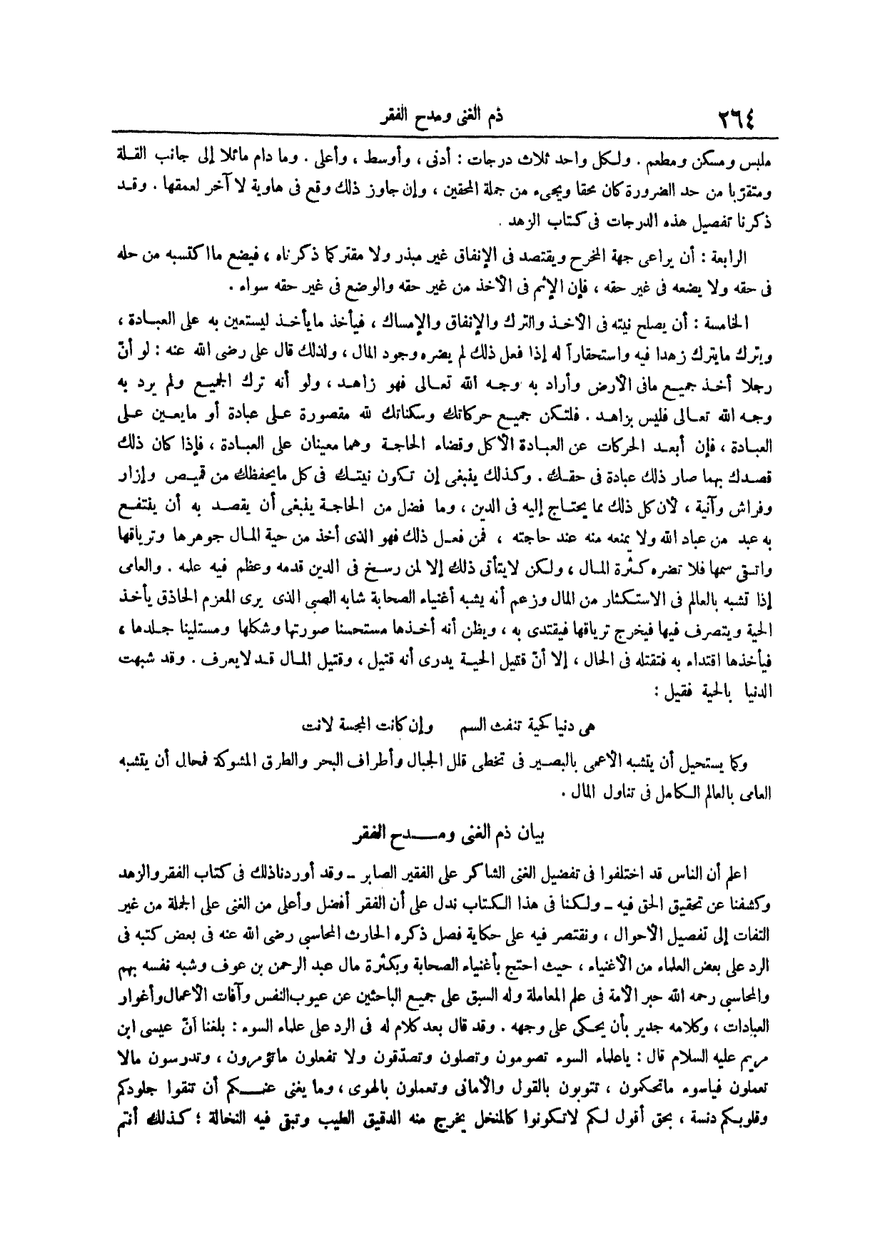 اعلم أن الناس قد اختلفوا في تفضيل الغني الشاكر على الفقير الصابر وقد أوردنا ذلك في كتاب الفقر والزهد وكشفنا عن تحقيق الحق فيه ولكنا في هذا الكتاب ندل على أن الفقر أفضل وأعلى من الغني على الجملة من غير التفات إلى تفصيل الأحوال ونقتصر فيه على حكاية فصل ذكره الحارث المحاسبي رضي الله عنه في بعض كتبه في الرد على بعض العلماء من الأغنياء حيث احتج بأغنياء الصحابة وبكثرة مال عبد الرحمن بن عوف وشبه نفسه بهم والمحاسبي رحمه الله حبر الأمة في علم المعاملة وله السبق على جميع الباحثين عن عيوب النفس وآفات الأعمال وأغوار العبادات وكلامه جدير بأن يحكى على وجهه