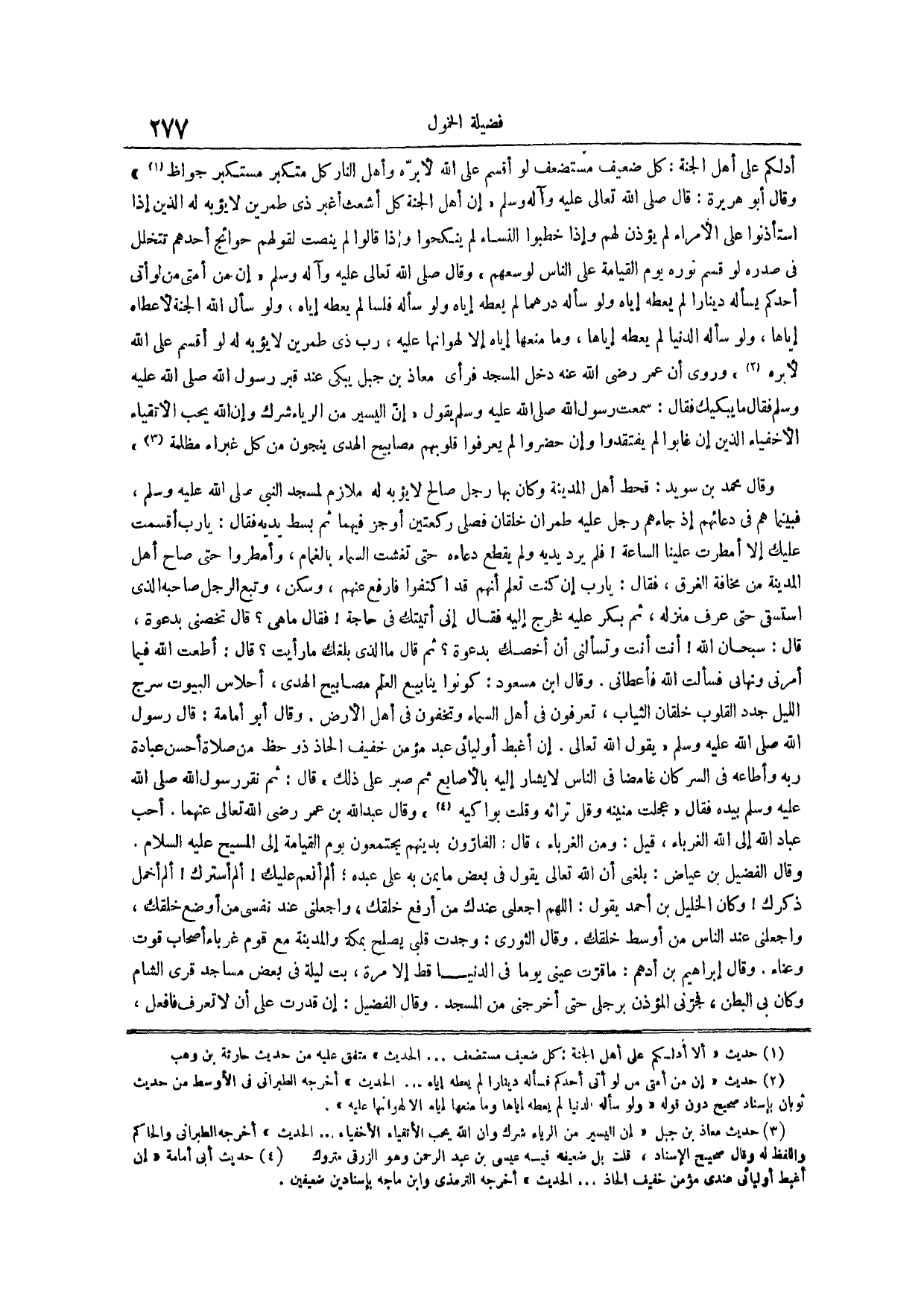 وقال أبو هريرة قال صلى الله عليه وسلم إن أهل الجنة كل أَشَعْثَ أَغْبَرَ ذِي طِمْرَيْنِ لَا يُؤْبَهُ لَهُ الذين إذا استأذنوا على الأمراء لم يؤذن لهم وإذا خطبوا النساء لم ينكحوا وإذا قالوا لم ينصت لقولهم حوائج أحدهم تتخلل في صدره لو قسم نوره يوم القيامة على الناس لوسعهم وَقَالَ صَلَّى اللَّهُ عَلَيْهِ وَسَلَّمَ إِنَّ مِنْ أمتي من لو أتى أحدكم يسأله ديناراً لم يعطه إياه ولو سأله درهما لم يعطه إياه ولو سأله فلساً لم يعطه إياه ولو سأل الله الجنة لأعطاه إياها ولو سأله الدنيا لم يعطه إياها وما منعها إياه إلا لهوانها عليه رب ذِي طِمْرَيْنِ لَا يُؤْبَهُ لَهُ لَوْ أَقْسَمَ على الله لأبره