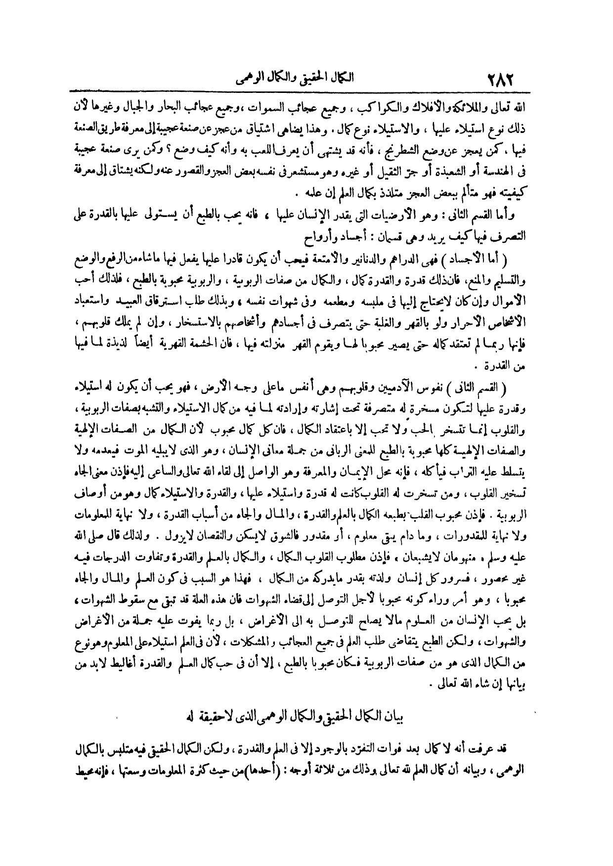 قد عرفت أنه لا كمال بعد فوات التفرد بالوجود إلا في العلم والقدرة ولكن الكمال الحقيقي فيه متلبس بالكمال الوهمي وبيانه أن كمال العلم لله تعالى وذلك من ثلاثة أوجه