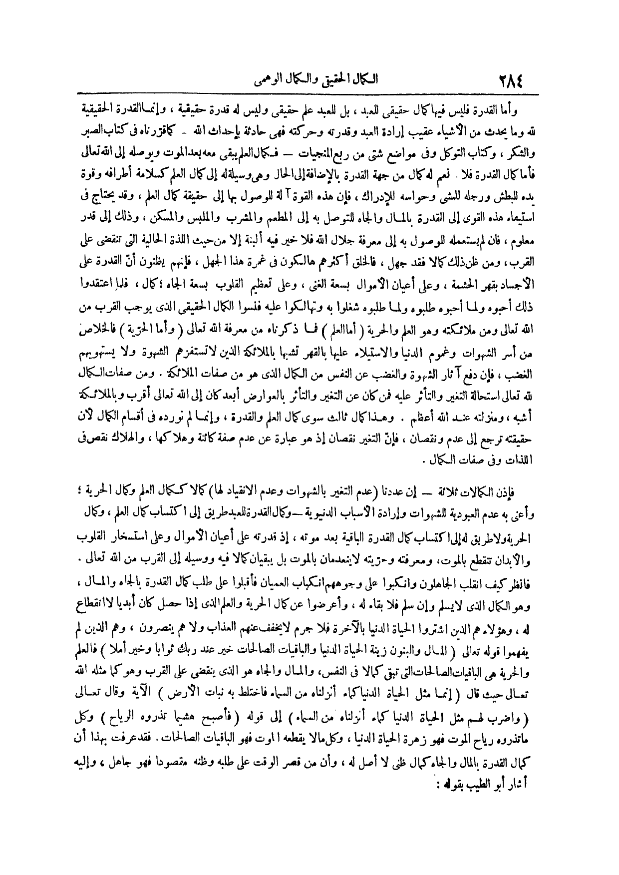 فقد عرفت بهذا أن كمال القدرة بالمال والجاه كمال ظني لا أصل له وأن من قصر الوقت على طلبه وظنه مقصوداً فهو جاهل وإليه أشار أبو الطيب بقوله