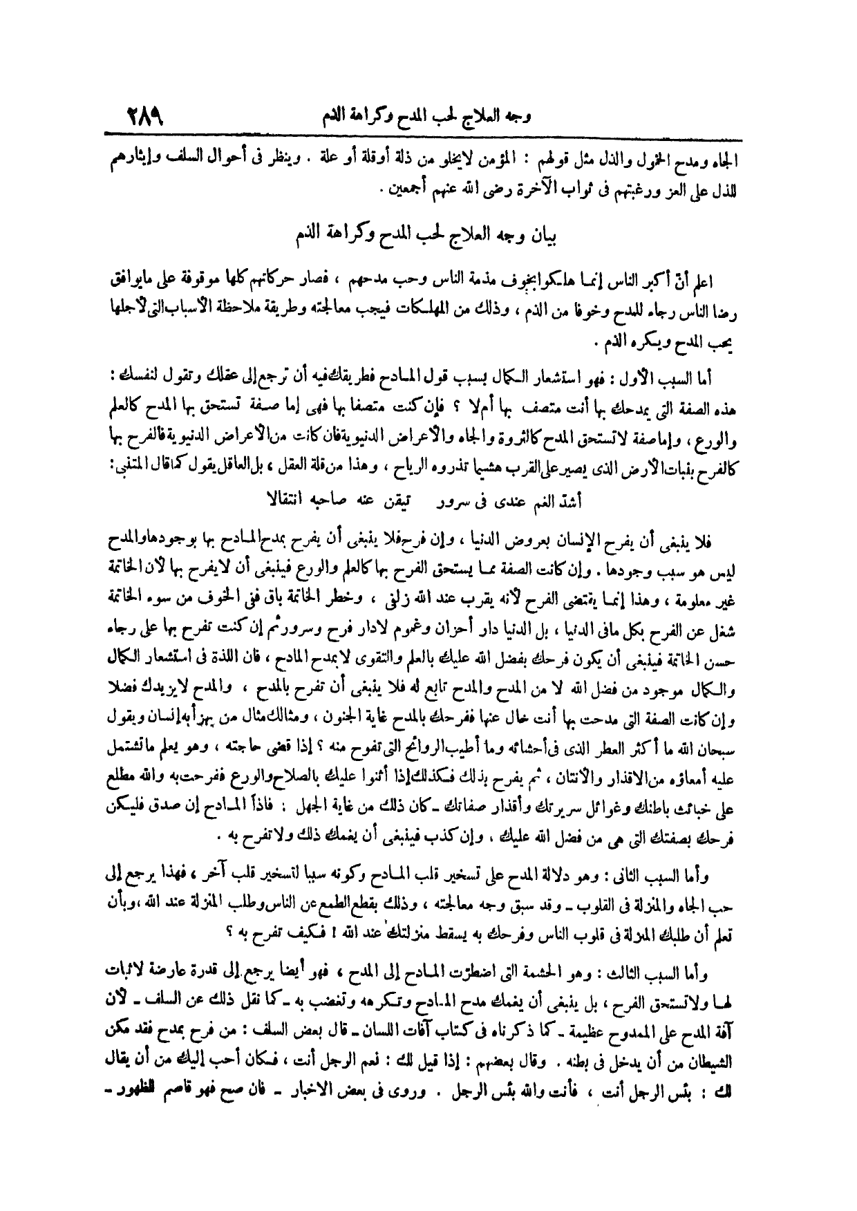 اعلم أن أكبر الناس إِنَّمَا هَلَكُوا بِخَوْفِ مَذَمَّةِ النَّاسِ وَحُبِّ مَدْحِهِمْ فصار حَرَكَاتُهُمْ كُلُّهَا مَوْقُوفَةً عَلَى مَا يُوَافِقُ رِضَا النَّاسِ رَجَاءً لِلْمَدْحِ وَخَوْفًا مِنَ الذَّمِّ وَذَلِكَ مِنَ الْمُهْلِكَاتِ فَيَجِبُ مُعَالَجَتُهُ وَطَرِيقُهُ مُلَاحَظَةُ الْأَسْبَابِ التي لأجلها يحب المدح ويكره الذم