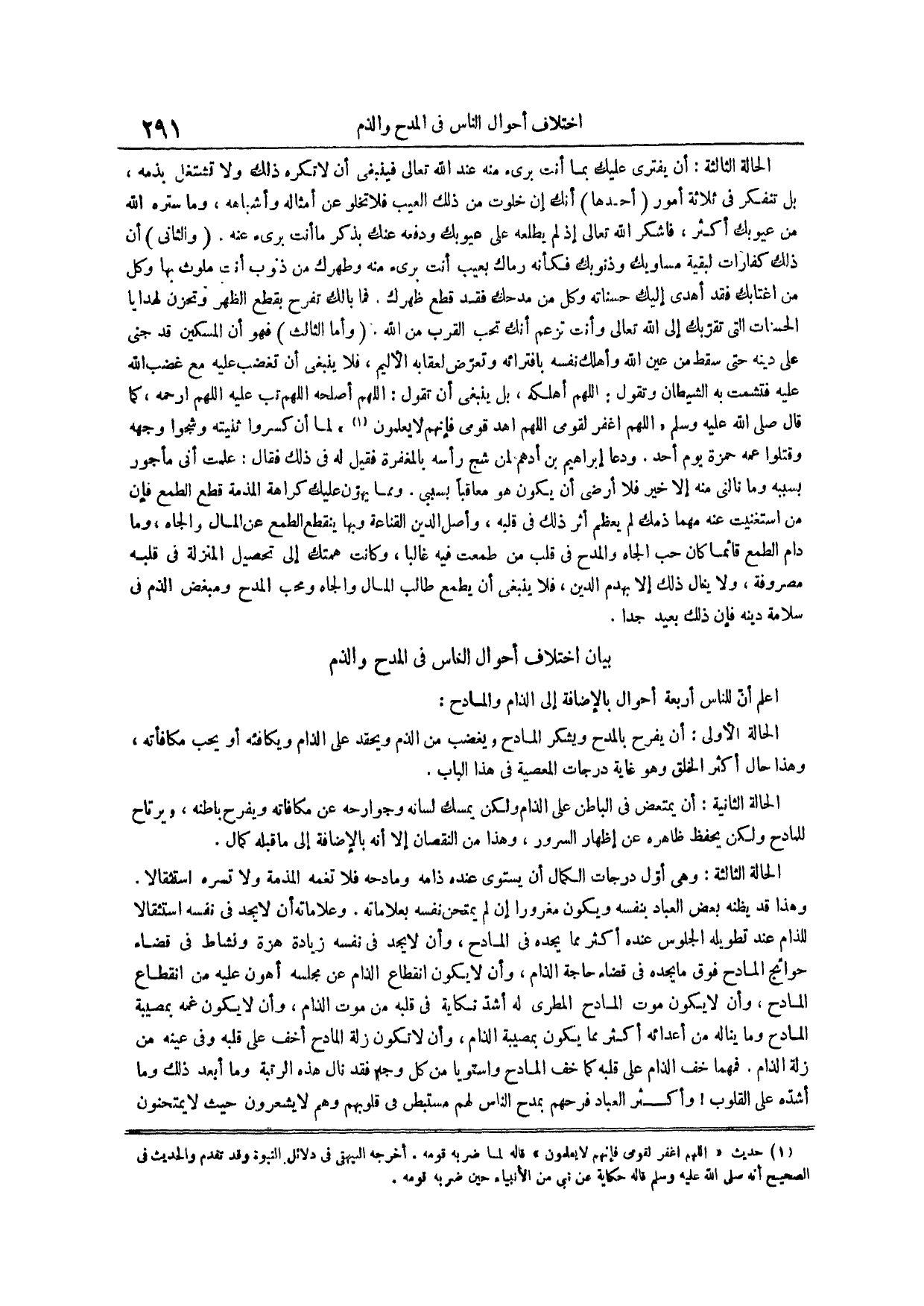 الحالة الأولى أن يفرح بالمدح ويشكر المادح ويغضب من الذم ويحقد على الذام ويكافئه أو يحب مكافأته وهذا حال أكثر الخلق وهو غاية درجات المعصية في هذا الباب