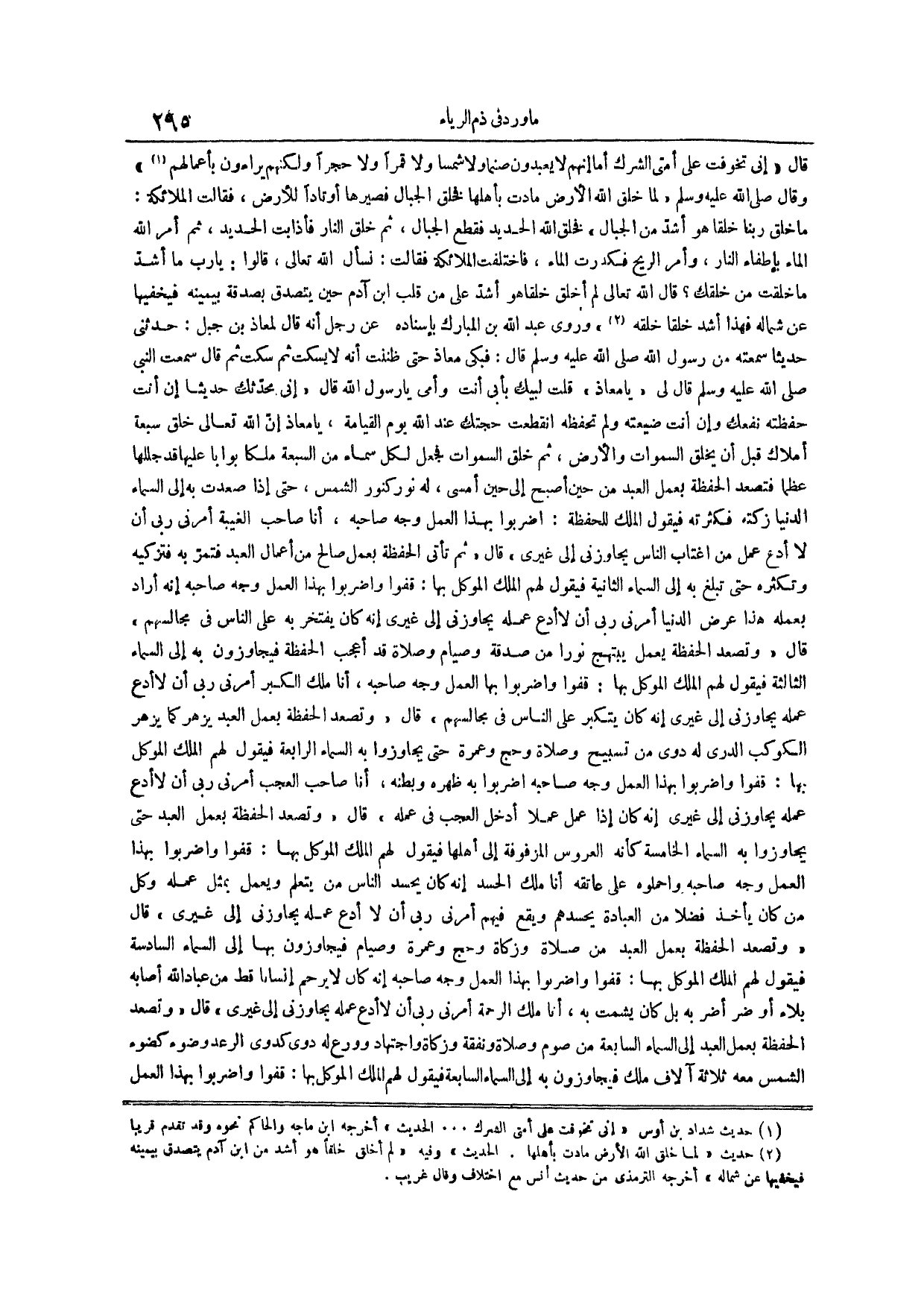 وروى عبد الله بن المبارك بإسناده عن رجل أنه قال لمعاذ بن جبل حدثني حديثاً سمعته من رسول الله صلى الله عليه وسلم قال فبكى معاذ حتى ظننت أنه لا يسكت ثم سكت ثم قال سمعت النبي صلى الله عليه وسلم قال لي يا معاذ قلت لبيك بأبي أنت وأمي يا رسول الله قال إني محدثك حديثاً إن أنت حفظته نفعك وإن أنت ضيعته ولم تحفظه انقطعت حجتك عند الله يوم القيامة يا معاذ أن الله تعالى خلق سبعة أملاك قبل أن يخلق السموات والأرض ثم خلق السموات فجعل لكل سماء من السبعة ملكاً بواباً عليها قد جللها عظماً فتصعد الحفظة بعمل العبد من حين أصبح إلى حين أمسى له نور كنور الشمس حتى إذا صعدت به إلى السماء الدنيا زكته فكثرته فيقول الملك للحفظة اضربوا بهذا العمل وجه صاحبه أنا صاحب الغيبة أمرني ربي أن لا أدع عمل من اغتاب الناس يجاوزني إلى غيري {قال} ثم تأتي الحفظة بعمل صالح من أعمال العبد فتمر به فتزكيه وتكثره حتى تبلغ به إلى السماء الثانية فيقول لهم الملك الموكل بها قفوا واضروا بهذا العمل وجه صاحبه إنه أراد بعمله هذا عرض الدنيا أمرني ربي أن لا أدع عمله يجاوزني إلى غيري إنه كان يفتخر به على الناس في مجالسهم {قال} وتصعد الحفظة يعلم يبتهج نوراً من صدقة وصيام وصلاة قد أعجب الحفظة فيجاوزون به إلى السماء الثالثة فيقول لهم الملك الموكل بها فقوا واضربوا بها العمل وجه صاحبه أنا ملك الكبر أمرني ربي أن لا أدع عمله يجاوزني إلى غيري إنه كان يتكبر على الناس في مجالسهم {قال} وتصعد الحفظة بعمل العبد يزهر كما يزهر الكوكب الدري له دوى من تسبيح وصلاة وحج وعمرة حتى يجاوزوا به السماء الرابعة فيقول لهم الملك الموكل بها قفوا واضربوا بهذا العمل وجه صاحبه اضربوا به ظهره وبطنه أنا صاحب العجب أمرني ربي أن لا أدع عمله يجاوزني إلى غيري إنه كان إذا عمل عملاً أدخل العجب في عمله {قال} وتصعد الحفظة بعمل العبد حتى يجاوزوا به السماء الخامسة كأنه العروس المزفوفة إلى أهلها فيقول لهم الملك الموكل بها قفوا واضروا بهذا العمل وجه صاحبه واحملوه على عاتقه أنا ملك الحسد إنه كان يحسد الناس من يتعلم ويعمل بمثل عمله وكل من كان يأخذ فضلاً من العبادة يحسدهم ويقع فيهم أمرني ربي أن لا أدع عمله يجاوزني إلى غيري {قال} وتصعد الحفظة بعمل العبد من صلاة وزكاة وحج وعمرة وصيام فيجاوزون بها إلى السماء السادسة فيقول لهم الملك الموكل بها قفوا واضربوا بهذا العمل وجه صاحبه إنه كان لا يرحم إنساناً قط من عباد الله أصابه بلاء أو ضر أضر به بل كان يشمت به أنا ملك الرحمة أمرني ربي أن لا أدع عمله يجاوزني إلى غيري {قال} وتصعد الحفظة بعمل العبد إلى السماء السابعة من صوم وصلاة ونفقة وزكاة واجتهاد وورع له دوي كدوي الرعد وضوء كضوء الشمس معه ثلاثة آلاف ملك فيجاوزون به إلى السماء السابعة فيقول لهم الملك الموكل بها قفوا واضربوا بهذا العمل