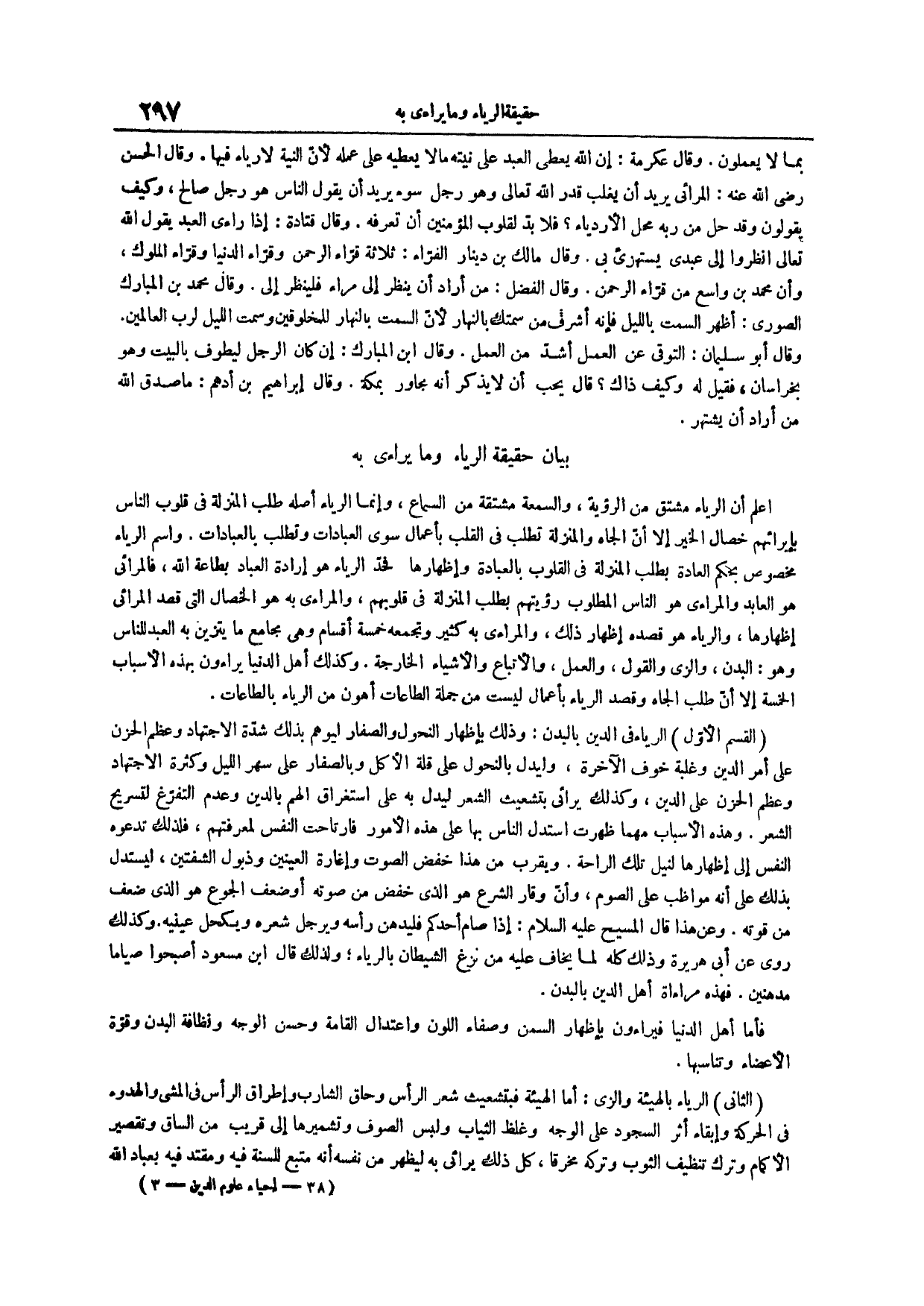 القسم الأول الرياء في الدين بالبدن وذلك بإظهار النُّحُولِ وَالصَّفَارِ لِيُوهِمَ بِذَلِكَ شِدَّةَ الِاجْتِهَادِ وَعِظَمَ الحزن على أمر الدين وغلبة خوف الآخرة وليدل بالنحول على قلة الأكل وبالصفار على سهر الليل وكثرة الاجتهاد وعظم الحزن على الدين وكذلك يرائي بتشعيث الشَّعْرِ لِيَدُلَّ بِهِ عَلَى اسْتِغْرَاقِ الْهَمِّ بِالدِّينِ وعدم التفرغ لتسريح الشعر