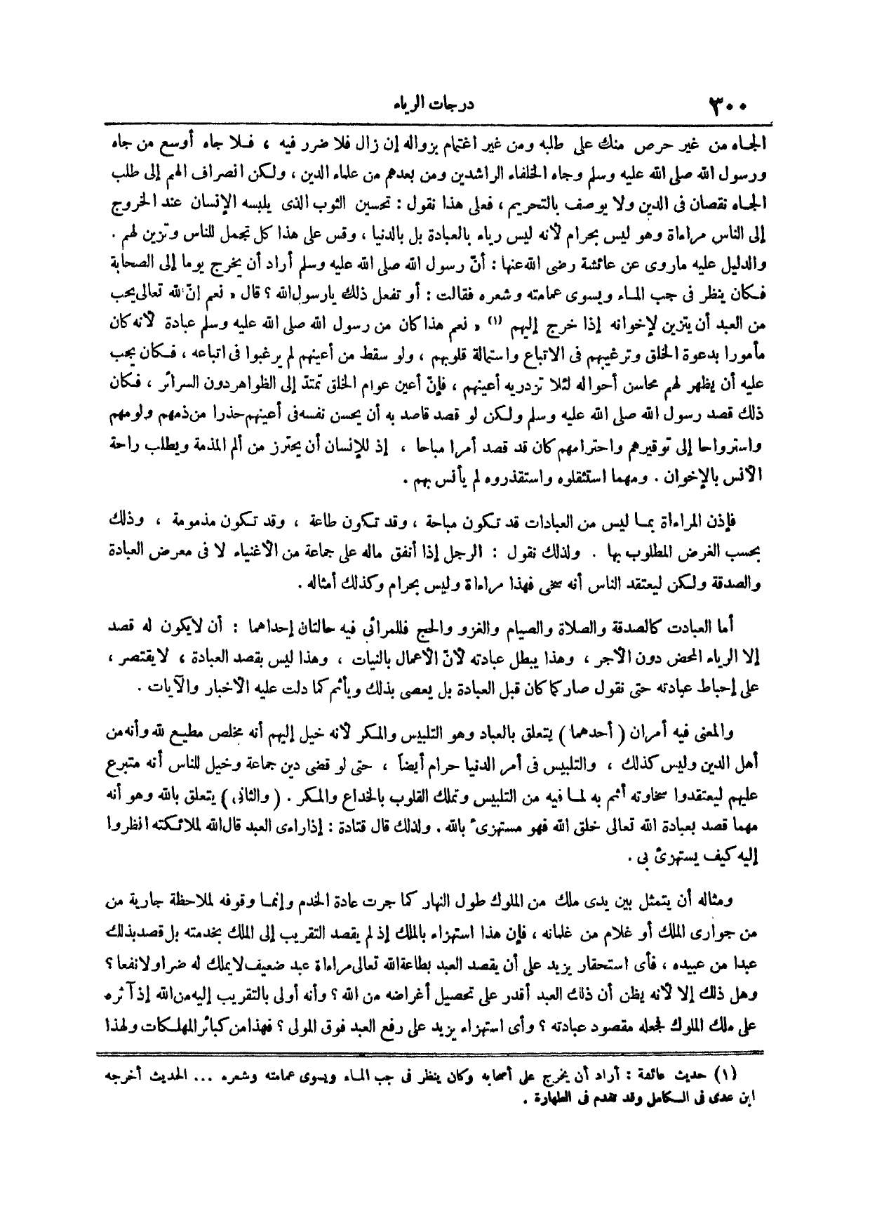 الجاه من غير حرص منك على طلبه ومن غير اغتمام بزواله إن زال فلا ضرر فيه فلا جاه أوسع من جاه ورسول الله صلى الله عليه وسلم وجاه الخلفاء الراشدين ومن بعدهم من علماء الدين ولكن انصراف الهم إلى طلب الجاه نقصان في الدين ولا يوصف بالتحريم فعلى هذا نقول تحسين الثوب الذي يلبسه الإنسان عند الخروج إلى الناس مراءاة وهو ليس بحرام لأنه ليس رياء بالعبادة بل بالدنيا وقس على هذا كل ما تجمل للناس وتزين لهم