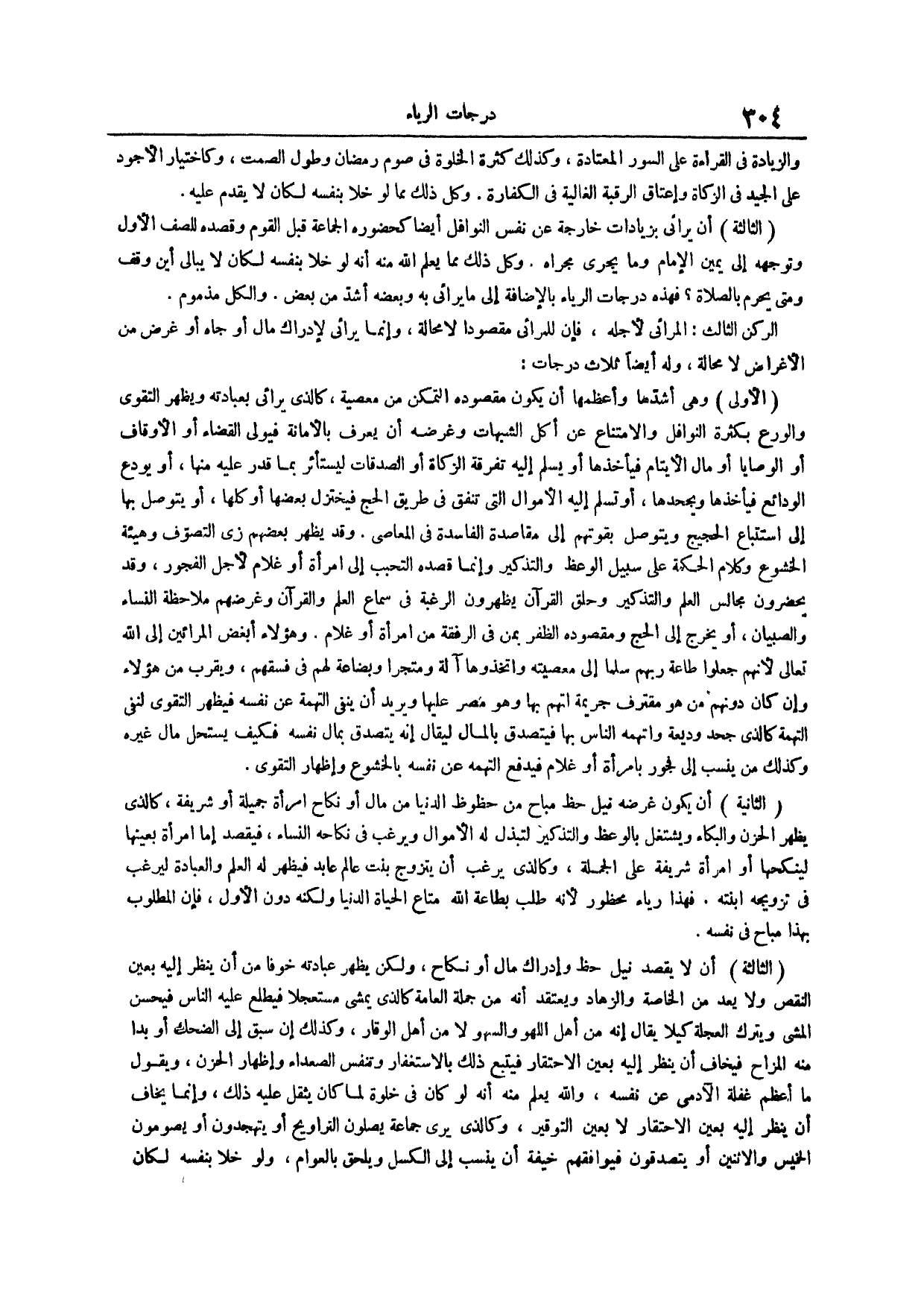 وَكُلُّ ذَلِكَ مِمَّا يَعْلَمُ اللَّهُ مِنْهُ أَنَّهُ لَوْ خَلَا بِنَفْسِهِ لَكَانَ لَا يُبَالِي أَيْنَ وَقَفَ وَمَتَى يُحْرِمُ بِالصَّلَاةِ فَهَذِهِ دَرَجَاتُ الرِّيَاءِ بالإضافة إلى ما يرائي بِهِ وَبَعْضُهُ أَشَدُّ مِنْ بَعْضٍ