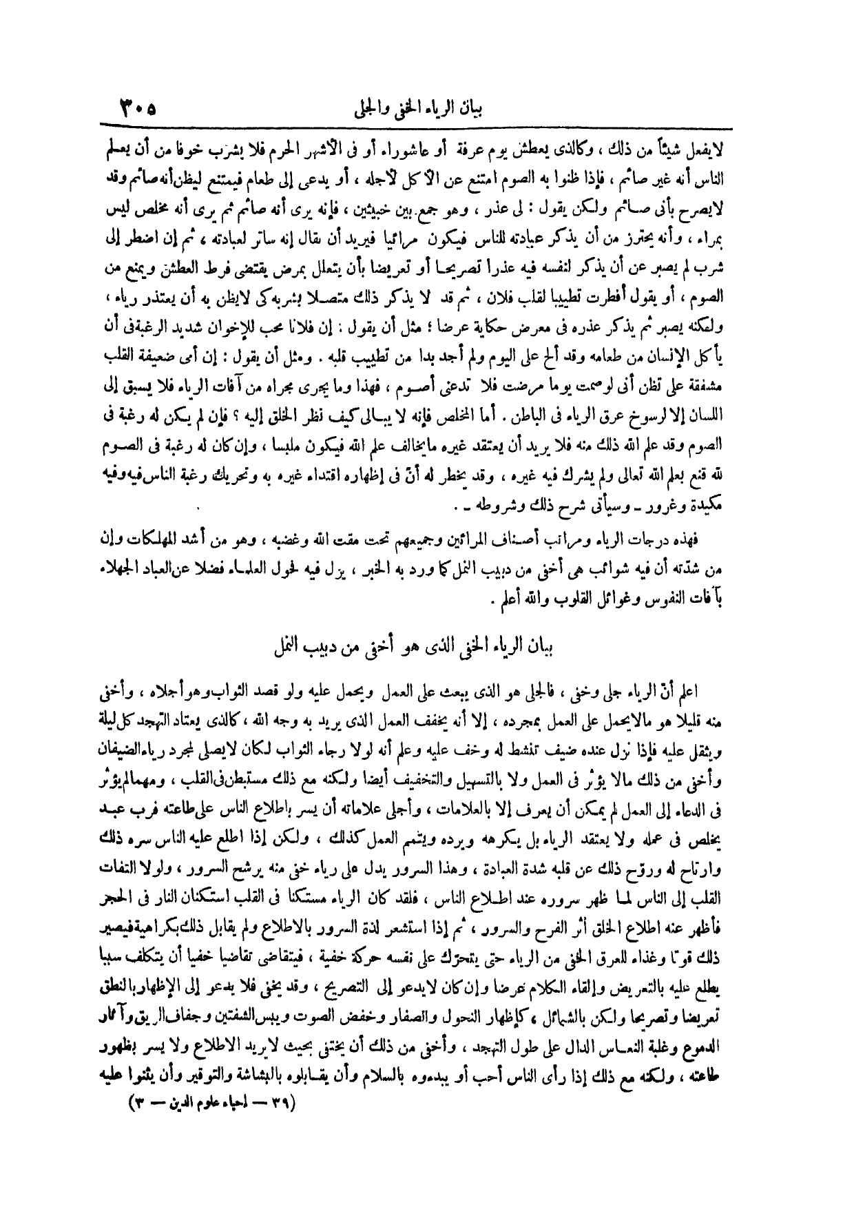 اعْلَمْ أَنَّ الرِّيَاءَ جَلِيٌّ وَخَفِيٌّ فَالْجَلِيُّ هُوَ الَّذِي يَبْعَثُ عَلَى الْعَمَلِ وَيَحْمِلُ عَلَيْهِ وَلَوْ قَصَدَ الثَّوَابَ وَهُوَ أَجْلَاهُ وَأَخْفَى مِنْهُ قَلِيلًا هُوَ مَا لَا يَحْمِلُ عَلَى الْعَمَلِ بِمُجَرَّدِهِ إِلَّا أَنَّهُ يُخَفِّفُ الْعَمَلَ الَّذِي يُرِيدُ بِهِ وَجْهَ اللَّهِ كَالَّذِي يَعْتَادُ التَّهَجُّدَ كُلَّ لَيْلَةٍ وَيَثْقُلُ عَلَيْهِ فَإِذَا نَزَلَ عِنْدَهُ ضيف تنشط له وخف عليه وعلم أنه لولا رجاء الثواب لكان لا يصلي لمجرد رياء الضيفان وَأَخْفَى مِنْ ذَلِكَ مَا لَا يُؤَثِّرُ فِي الْعَمَلِ وَلَا بِالتَّسْهِيلِ وَالتَّخْفِيفِ أَيْضًا وَلَكِنَّهُ مَعَ ذلك مستبطن في القلب ومهما لم يؤثر في الدعاء إلى العمل لم يمكن أن يعرف إلا بالعلامات وَأَجْلَى عَلَامَاتِهِ أَنْ يُسَرَّ بِاطِّلَاعِ النَّاسِ عَلَى طَاعَتِهِ فَرُبَّ عَبْدٍ يُخْلِصُ فِي عَمَلِهِ وَلَا يَعْتَقِدُ الرِّيَاءَ بَلْ يَكْرَهُهُ وَيَرُدُّهُ وَيُتَمِّمُ الْعَمَلَ كَذَلِكَ وَلَكِنْ إِذَا اطَّلَعَ عَلَيْهِ النَّاسُ سَرَّهُ ذَلِكَ وَارْتَاحَ لَهُ وَرَوَّحَ ذَلِكَ عَنْ قَلْبِهِ شِدَّةَ الْعِبَادَةِ وَهَذَا السُّرُورُ يَدُلُّ عَلَى رِيَاءٍ خَفِيٍّ مِنْهُ يُرَشِّحُ السُّرُورَ وَلَوْلَا الْتِفَاتُ الْقَلْبِ إلى الناس لما ظَهَرَ سُرُورُهُ عِنْدَ اطِّلَاعِ النَّاسِ فَلَقَدْ كَانَ الرِّيَاءُ مُسْتَكِنًّا فِي الْقَلْبِ اسْتِكْنَانَ النَّارِ فِي الحجر فأظهر عنه اطِّلَاعُ الْخَلْقِ أَثَرَ الْفَرَحِ وَالسُّرُورِ ثُمَّ إِذَا اسْتَشْعَرَ لَذَّةَ السُّرُورِ بِالِاطِّلَاعِ وَلَمْ يُقَابِلْ ذَلِكَ بِكَرَاهِيَةٍ فَيَصِيرُ ذَلِكَ قُوتًا وَغِذَاءً لِلْعِرْقِ الْخَفِيِّ من الرِّيَاءِ حَتَّى يَتَحَرَّكَ عَلَى نَفْسِهِ حَرَكَةً خَفِيَّةً فَيَتَقَاضَى تَقَاضِيًا خَفِيًّا أَنْ يَتَكَلَّفَ سَبَبًا يُطَّلَعُ عليه بالتعريض وإلقاء الكلام عرضاً وإن كان لا يدعو إلى التصريح وقد يخفى فلا يدعو إلى الإظهار بالنطق تعريضاً وتصريحاً ولكن بالشمائل كإظهار النحول والصفار وخفض الصوت ويبس الشفتين وجفاف الريق وآثار الدموع وغلبة النعاس الدال على طول التهجد وَأَخْفَى مِنْ ذَلِكَ أَنْ يَخْتَفِيَ بِحَيْثُ لَا يُرِيدُ الِاطِّلَاعَ وَلَا يُسَرُّ بِظُهُورِ طَاعَتِهِ وَلَكِنَّهُ مَعَ ذَلِكَ إِذَا رَأَى النَّاسَ أَحَبَّ أَنْ يبدءوه بالسلام وأن يُقَابِلُوهُ بِالْبَشَاشَةِ وَالتَّوْقِيرِ وَأَنْ يُثْنُوا عَلَيْهِ