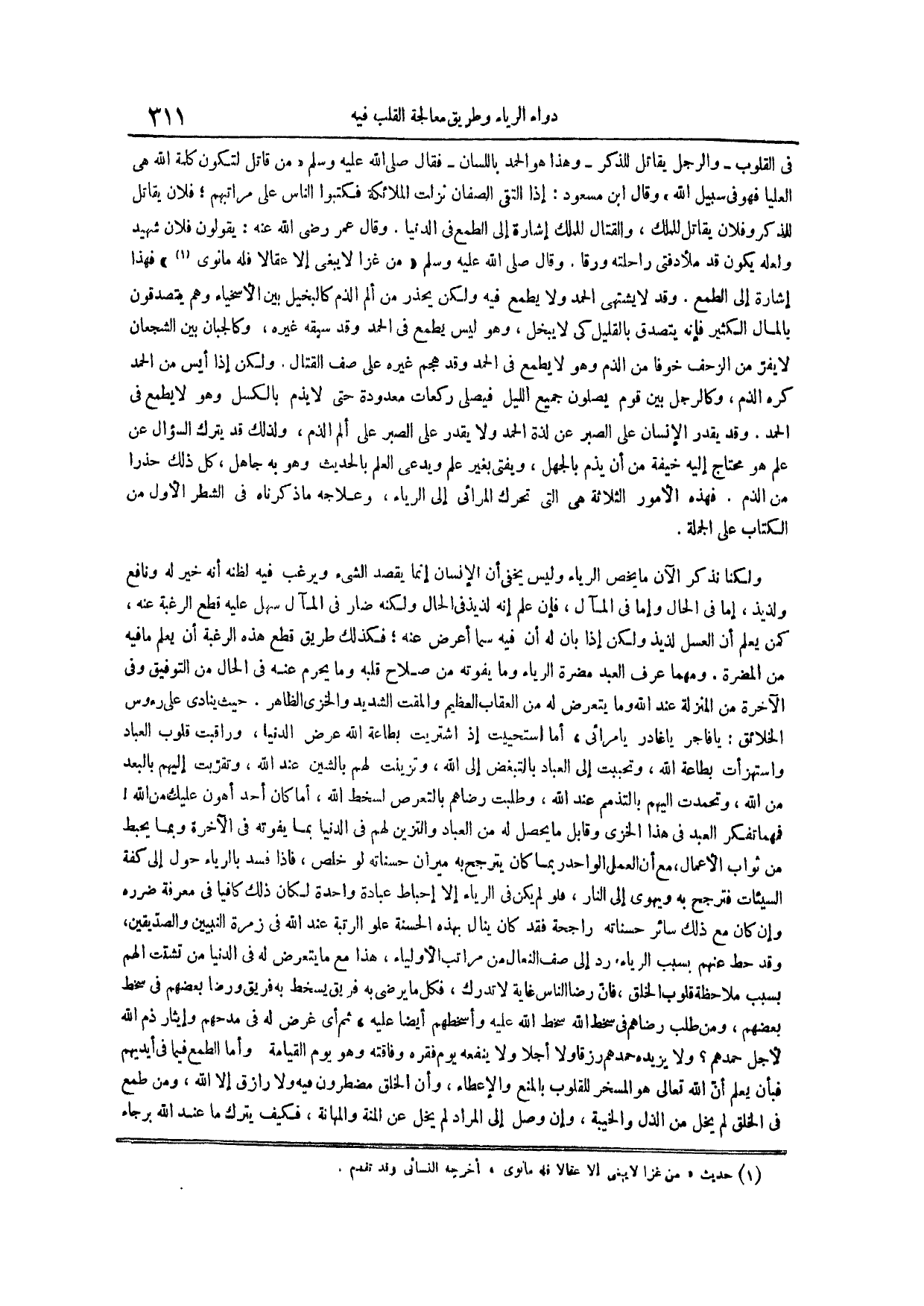 فهذه الأمور الثَّلَاثَةُ هِيَ الَّتِي تُحَرِّكُ الْمُرَائِيَ إِلَى الرِّيَاءِ وعلاجه ما ذكرناه في الشطر الأول من الكتاب على الجملة