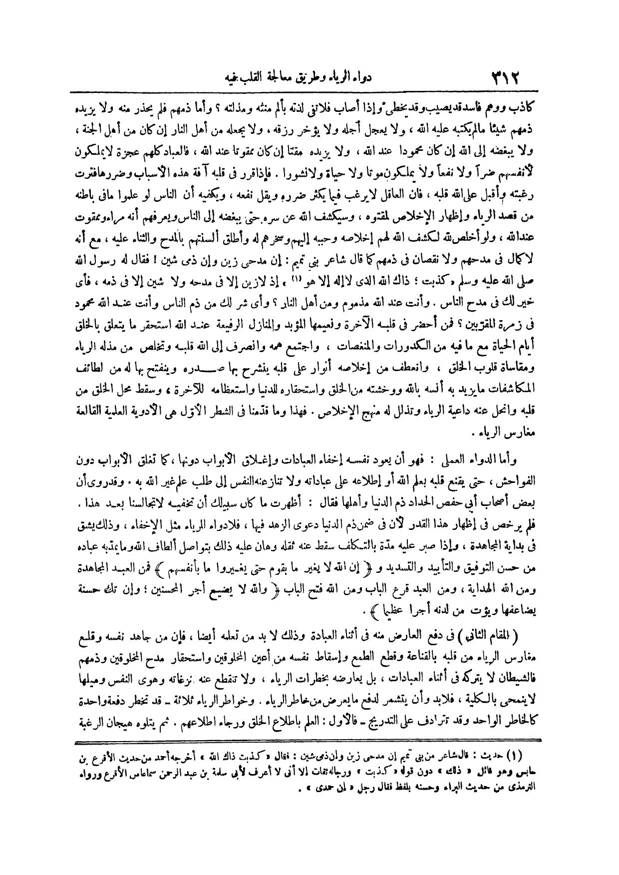 فَإِذَا قُرِّرَ فِي قَلْبِهِ آفَةُ هَذِهِ الْأَسْبَابِ وَضَرَرُهَا فَتَرَتْ رَغْبَتُهُ وَأَقْبَلَ عَلَى اللَّهِ قَلْبُهُ فإن العاقل لَا يَرْغَبُ فِيمَا يَكْثُرُ ضَرَرُهُ وَيَقِلُّ نَفْعُهُ ويكفيه أن الناس لو علموا ما في باطنه من قصد الرياء وإظهار الإخلاص لمقتوه وسيكشف الله عن سره حتى يبغضه إلى الناس ويعرفهم أنه مراء وممقوت عند الله ولو أخلص لله لكشف الله لهم إخلاصه وحببه إليهم وسخرهم له وأطلق ألسنتهم بالمدح والثناء عليه مع أنه لا كمال في مدحهم ولا نقصان في ذمهم كما قال شاعر بني تميم إن مدحي زين وإن ذمي شين فقال لَهُ رَسُولُ اللَّهِ صَلَّى اللَّهُ عَلَيْهِ وَسَلَّمَ كذبت ذاك الله الذي لا إله إلا هو // حديث قال شاعر من بني تميم إن مدحي زين وإن ذمي شين فقال كذبت ذاك الله أخرجه أحمد من حديث الأقرع بن حابس وهو قائل ذلك دون قوله كذبت ورجاله ثقات إلا أني لا أعرف لأبي سلمة بن عبد الرحمن سماعا من الأقرع ورواه الترمذي من حديث البراء وحسنه بلفظ فقال رجل إن حمدي