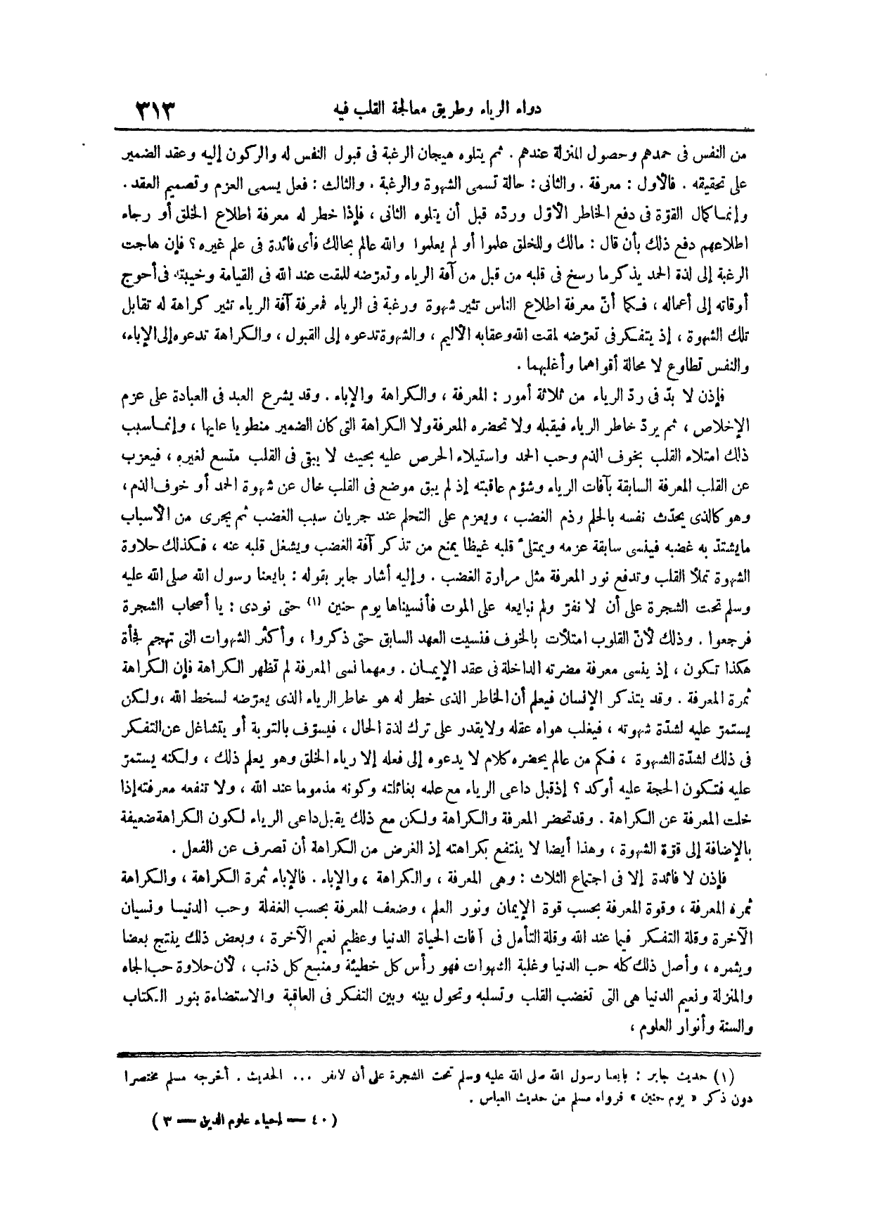 وإنما كمال القوة في دفع الخاطر الأول ورده قبل أن يتلوه الثاني فإذا خطر له معرفة اطلاع الخلق أو رجاء اطلاعهم دفع ذلك بأن قال مالك وَلِلْخَلْقِ عَلِمُوا أَوْ لَمْ يَعْلَمُوا وَاللَّهُ عَالِمٌ بِحَالِكَ فَأَيُّ فَائِدَةٍ فِي عِلْمِ غَيْرِهِ فَإِنْ هاجت الرغبة إلى لذة الحمد يذكر مَا رَسَخَ فِي قَلْبِهِ مِنْ قَبْلُ مِنْ آفة الرياء وتعرضه للمقت عند الله في القيامة وخيبته في أحوج أوقاته إلى أعماله فكما أن معرفة اطلاع الناس تثير شهوة ورغبة في الرياء فمعرفة آفة الرياء تثير كراهة له تقابل تلك الشهوة إذ يتفكر في تعرضه لمقت الله وعقابه الأليم والشهوة تدعوه إلى القبول والكراهة تدعوه إلى الإباء والنفس تطاوع لا محالة أقواهما وأغلبهما