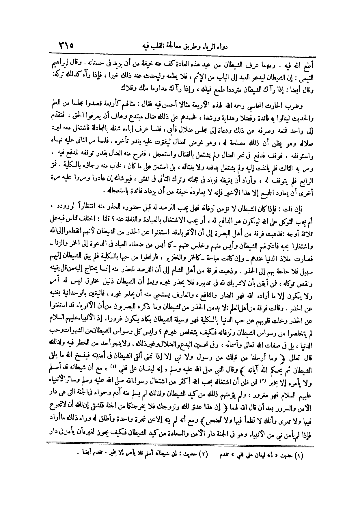وضرب الحارث المحاسبي رحمه الله لهذه الأربعة مثالاً أحسن فيه فقال مثالهم كأربعة قصدوا مجلساً من العلم والحديث لينالوا به فائدة وفضلاً وهداية ورشداً فحسدهم على ذلك ضال مبتدع وخاف أن يعرفوا الحق فتقدم إلى واحد فمنعه وصرفه عن ذلك ودعاه إلى مجلس ضلال فأبى فلما عرف إباءه شغله بالمجادلة فاشتغل معه ليرد ضلاله وهو يظن أن ذلك مصلحة له وهو غرض الضال ليفوت عليه بقدر تأخره