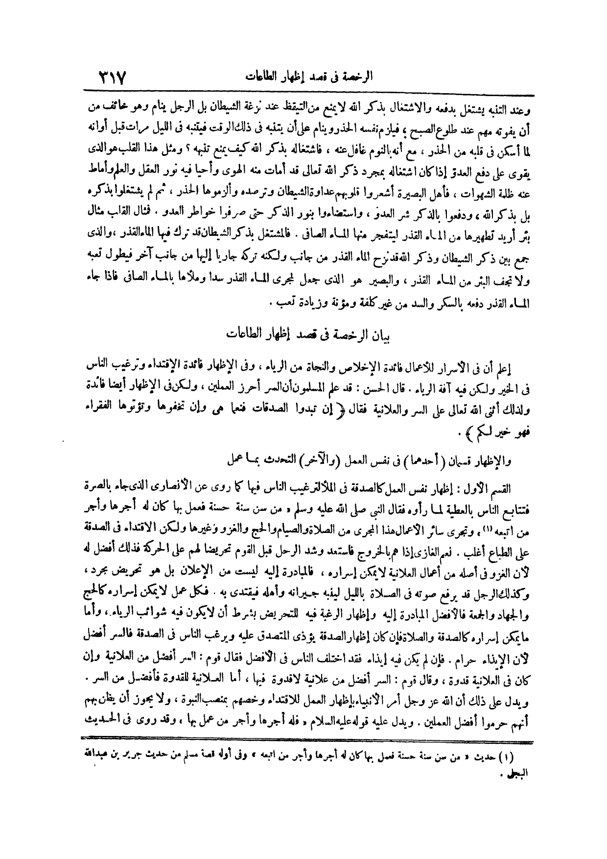 الْقِسْمُ الْأَوَّلُ إِظْهَارُ نَفْسِ الْعَمَلِ كَالصَّدَقَةِ فِي الْمَلَأِ لِتَرْغِيبِ النَّاسِ فِيهَا كَمَا رُوِيَ عَنِ الْأَنْصَارِيِّ الَّذِي جَاءَ بِالصُّرَّةِ فَتَتَابَعَ النَّاسُ بِالْعَطِيَّةِ لَمَّا رَأَوْهُ فَقَالَ النَّبِيُّ صَلَّى الله عليه وسلم من سن سنة حسنة فَعَمِلَ بِهَا كَانَ لَهُ أَجْرُهَا وَأَجْرُ مَنِ اتبعه // حديث من سن سنة حسنة فَعَمِلَ بِهَا كَانَ لَهُ أَجْرُهَا وَأَجْرُ مَنِ اتبعه وفي أوله قصة مسلم من حديث جرير بن عبد الله البيهقي