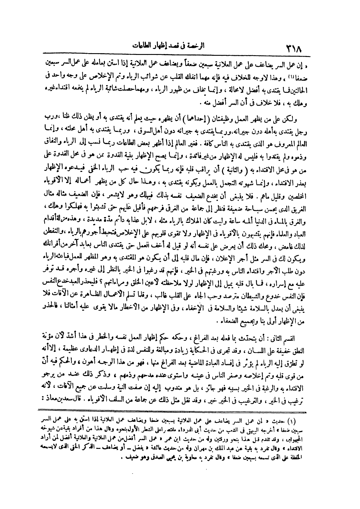 إِحْدَاهُمَا أن يظهره حيث يعلم أنه يقتدي به أو يظن ذلك ظَنًّا وَرُبَّ رَجُلٍ يَقْتَدِي بِهِ أَهْلُهُ دُونَ جِيرَانِهِ وَرُبَّمَا يَقْتَدِي بِهِ جِيرَانُهُ دُونَ أَهْلِ السُّوقِ وَرُبَّمَا يَقْتَدِي بِهِ أَهْلُ مَحَلَّتِهِ وَإِنَّمَا الْعَالِمُ الْمَعْرُوفُ هُوَ الَّذِي يَقْتَدِي بِهِ النَّاسُ كَافَّةً