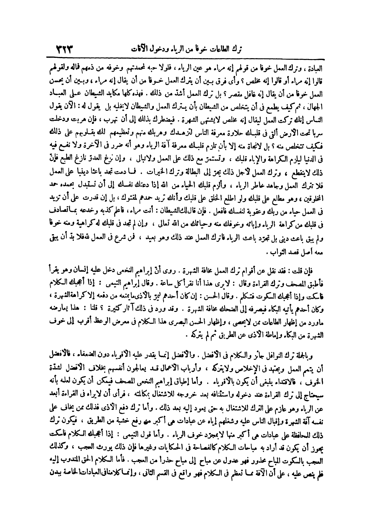 وأما إطباق إبراهيم النخعي المصحف فيمكن أن يكون لعلمه بأنه سيحتاج إلى ترك القراءة عند دخوله واستئنافه بعد خروجه للاشتغال بمكالمته فرأى أن لا يراه في القراءة أبعد عن الرياء وهو عازم على الترك للاشتغال به حتى يعود إليه بعد ذلك وأما ترك دفع الأذى فذلك ممن يخاف على نفسه آفة الشهرة وإقبال الناس عليه وشغلهم إياه عن عبادات هي أكبر من رفع خشبة من الطريق فيكون ترك ذلك للمحافظة على عبادات هي أكبر منها لا بمجرد خوف الرياء