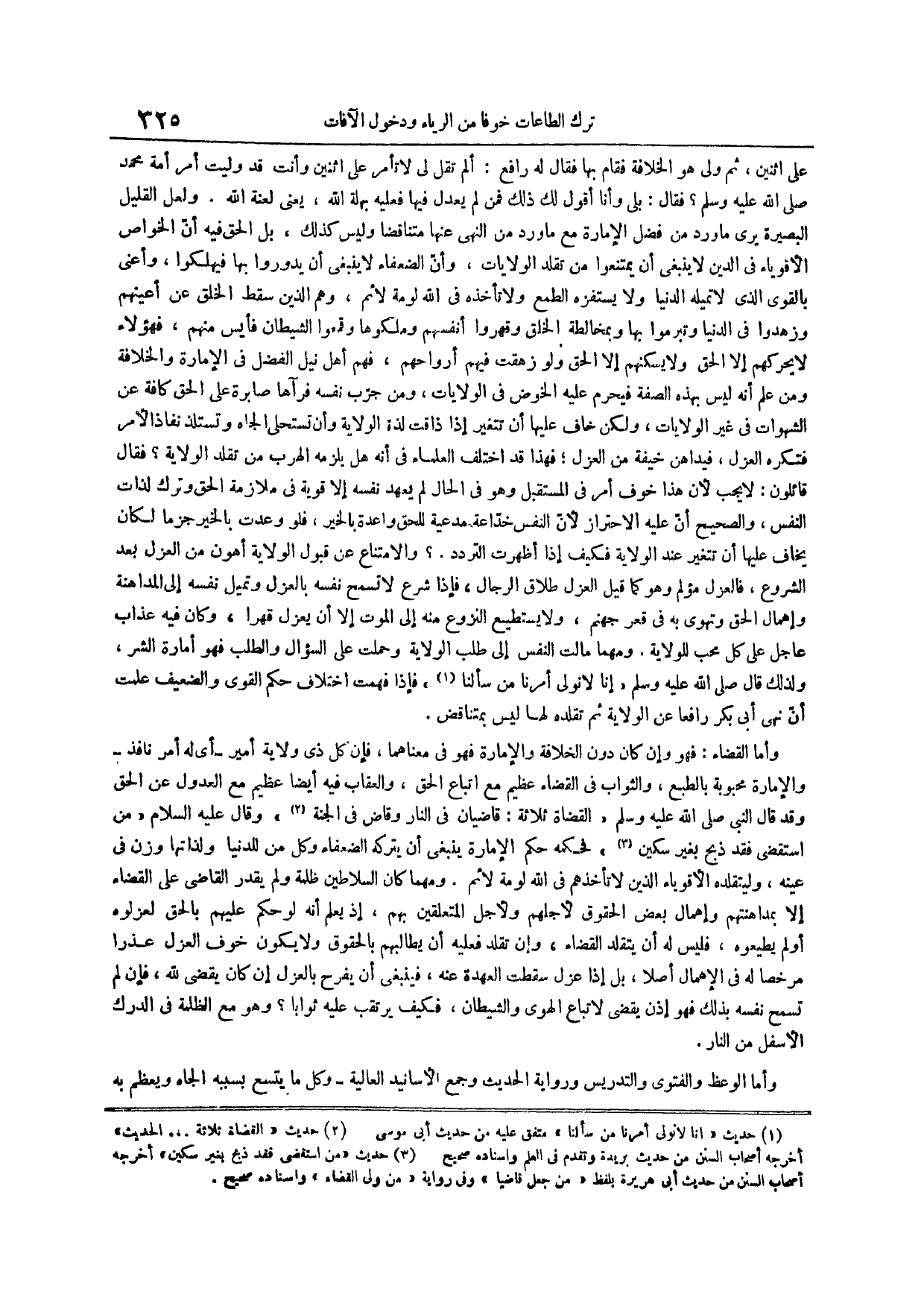 ولعل القليل البصيرة يرى ما ورد من فضل الإمارة مع ما ورد من النهي عنها متناقضاً وليس كذلك بل الحق فيه أن الخواص الأقوياء في الدين لا ينبغي أن يمتنعوا من تقلد الولايات وأن الضعفاء لا ينبغي أن يدوروا بها فيهلكوا وأعني بالقوي الذي لا تميله الدنيا ولا يستفزه الطمع ولا تأخذه في الله لومة لائم وهم الذين سقط الخلق عن أعينهم وزهدوا في الدنيا وتبرموا بها وبمخالطة الخلق وقهروا أنفسهم وملكوها وقمعوا الشيطان فأيس منهم فهؤلاء لا يحركهم إلا الحق ولا يسكنهم إلا الحق ولو زهقت فيهم أرواحهم فهم أهل نيل الفضل في الإمارة والخلافة ومن علم أنه ليس بهذه الصفة فيحرم عليه الخوض في الولايات ومن جرب نفسه فرآها صابرة على الحق كافة عن الشهوات في غير الولايات ولكن خاف عليها أن تتغير إذا ذاقت لذة الولاية وأن تستحلي الجاه وتستلذ نفاذ الأمر فتكره العزل فيداهن خيفة من العزل فهذا قد اختلف العلماء في أنه هل يلزمه الهرب من تقلد الولاية فقال قائلون لا يجب لأن هذا خوف أمر في المستقبل وهو في الحال لم يعهد نفسه إلا قوية في ملازمة الحق وترك لذات النفس والصحيح أن عليه الاحتراز لأن النفس خداعة مدعية للحق واعدة بالخير فلو وعدت بالخير جزماً لكان يخاف عليها أن تتغير عند الولاية فكيف إذا أظهرت التردد