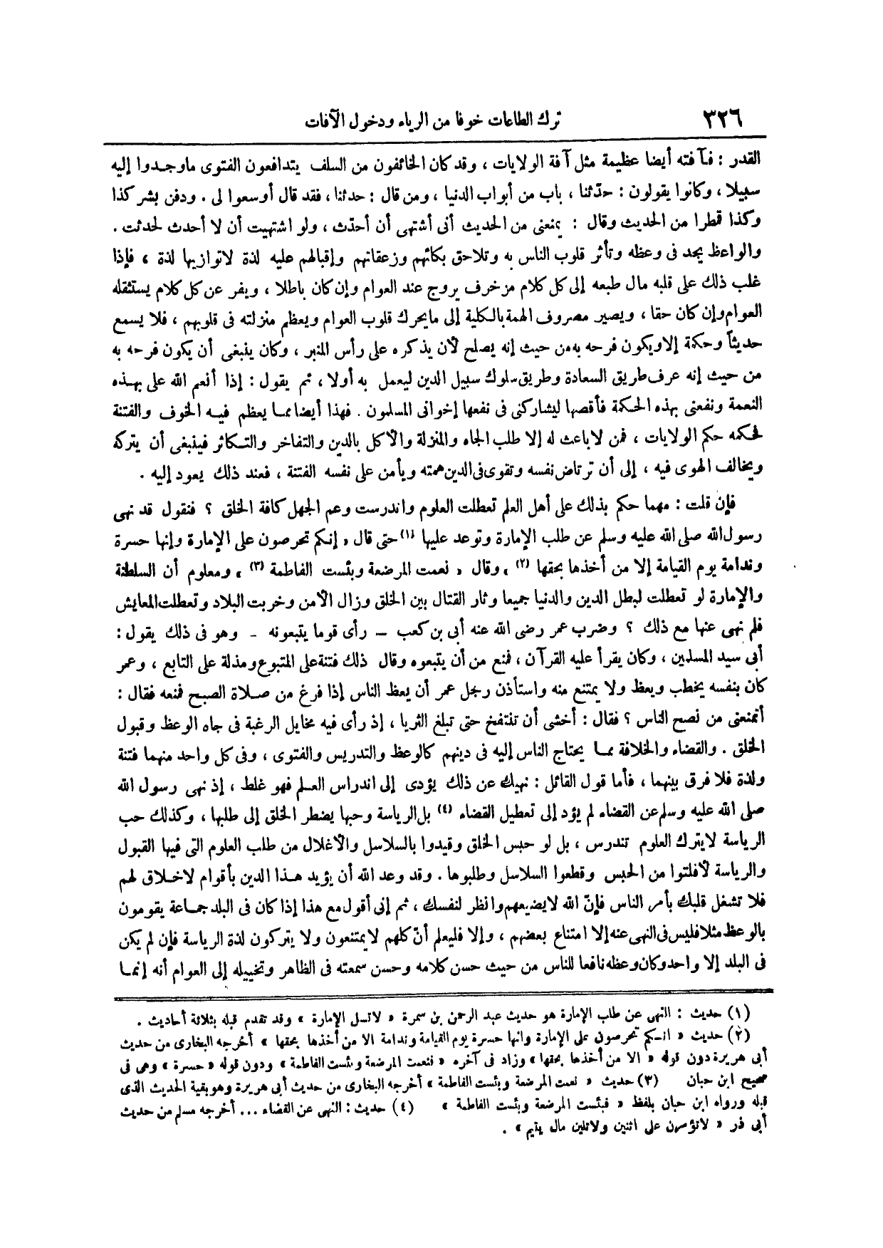 ومعلوم أن السلطنة والإمارة لو تعطلت لبطل الدين والدنيا جميعاً وثار القتال بين الخلق وزال الأمن وخربت البلاد وتعطلت المعايش فلم نهي عنها مع ذلك وضرب عمر رضي الله عنه أبي بن كعب رأى قوماً يتبعونه وهو في ذلك يقول أبي سيد المسلمين وكان يقرأ عليه القرآن فمنع من أن يتبعوه وقال ذلك فتنة على المتبوع ومذلة على التابع وعمر كان بنفسه يخطب ويعظ ولا يمتنع منه واستأذن رجل عمر أن يعظ الناس إذا فرغ من صلاة الصبح فمنعه فقال أتمنعني من نصح الناس فقال أخشى أن تنتفخ حتى تبلغ الثريا إذ رأى فيه مخايل الرغبة في جاه الوعظ وقبول الخلق