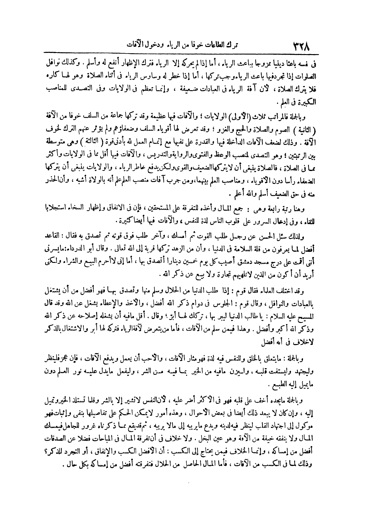 وبالجملة ما يتعلق بالخلق وللنفس فيه لذة فهو مثار الآفات والأحب أن يعمل ويدفع الآفات فإن عجز فلينظر وليجتهد وليستفت قلبه وليزن ما فيه من الخير بما فيه من الشر وليفعل ما يدل عليه نور العلم دون ما يميل إليه الطبع