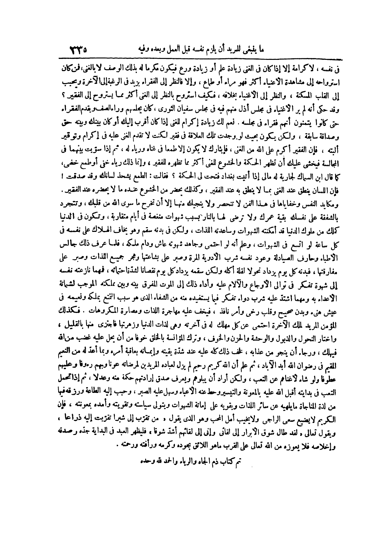 فكذلك المؤمن المريد لملك الآخرة احتمى عن كل مهلك له في آخرته وهي لذات الدنيا وزهرتها فاجتزى منها بالقليل واختار النحول والذبول والوحشة والحزن والخوف وترك المؤانسة بالخلق خوفاً من أن يحل عليه غضب من الله فيهلك ورجاء أن ينجو من عذابه فخف ذلك كله عليه عند شدة يقينه وإيمانه بعاقبة أمره وبما أعد له من النعيم المقيم في رضوان الله أبد الآباد ثم علم أن الله كريم رحيم لمن يزل لعباده المريدين لمرضاته عونا وبهم رءوفا وعليهم عطوفاً ولو شاء لأغنانهم عن التعب ولكن أراد أن يبلوهم ويعرف صدق إرادتهم حكمة منه وعدلاً ثم إذا تحمل التعب في بدايته أقبل الله عليه بالمعونة والتيسير وحط عنه الأعباء وسهل عليه الصبر وحبب إليه الطاعة ورزقه فيها من لذة المناجاة ما يلهيه عن سائر اللذات ويقويه على إماتة الشهوات ويتولى سياسته وتقويته وأمده بمعونته فإن الكريم لا يضيع سعي الراجي ولا يخيب أمل المحب وهو الذي يقول من تقرب إلي شبراً تقربت إليه ذراعاً ويقول تعالى لقد طال شوق الأبرار إلى لقائي وإني إلى لقائهم أشد شوقاً فليظهر العبد في البداية جده وصدقه وإخلاصه فلا يعوزه من الله تعالى على القرب ما هو اللائق بجوده وكرمه ورأفته ورحمته تم كتاب ذم الجاه والرياء والحمد لله وحده
