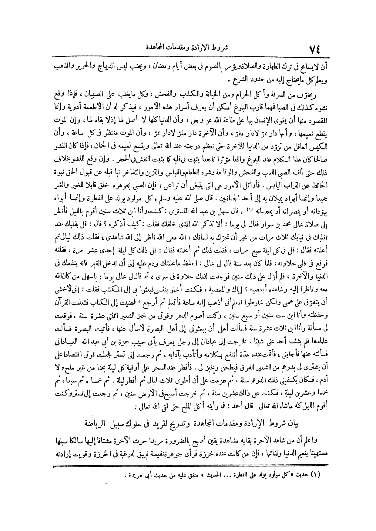 وَيُخَوَّفُ مِنَ السَّرِقَةِ وَأَكْلِ الْحَرَامِ وَمِنَ الخيانة والكذب والفحش وكل ما يغلب على الصبيان فإذا وقع نشوه كَذَلِكَ فِي الصِّبَا فَمَهْمَا قَارَبَ الْبُلُوغَ أَمْكَنَ أن يعرف أسرار هذه الأمور فيذكر له أن الأطعمة أدوية وإنما المقصود منها أن يقوى الإنسان بها على طاعة الله عز وجل وإن الدنيا كلها لا أصل لها إذ لا بقاء لها وإن الموت يقطع نعيمها وأنها دار ممر لا دار مقر وأن الآخرة دار مقر لا دار ممر وأن الموت منتظر في كل ساعة وأن الكيس العاقل من تزود من الدنيا للآخرة حتى تعظم درجته عند الله تعالى ويتسع نعيمه في الجنان فإذا كان النشو صالحاً كان هذا الكلام عند البلوغ واقعاً مؤثراُ ناجعاً يثبت في قلبه كما يثبت النقش في الحجر وإن وقع النشو بخلاف ذلك حتى ألف الصبي اللعب والفحش والوقاحة وشره الطعام واللباس والتزين والتفاخر نبا قبله عن قبول الحق نبوة الحائط عن التراب اليابس فأوائل الأمور هي التي ينبغي أن تراعى فإن الصبي بجوهره خلق قابلاً للخير والشر جميعاً وإنما أبواه يميلان به إلى أحد الجانبين قال صلى الله عليه وسلم كل مولود يولد على الْفِطْرَةِ وَإِنَّمَا أَبَوَاهُ يُهَوِّدَانِهِ أَوْ يُنَصِّرَانِهِ أَوْ يمجسانه (¬1) قال سهل بن عبد الله التستري كنت وأنا ابن ثلاث سنين أقوم بالليل فأنظر إلى صلاة خالي محمد بن سوار فقال لي يوماً ألا تذكر الله الذي خلقك فقلت كيف أذكره قال قل بقلبك عند تقلبك في ثيابك ثلاث مرات من غير أن تحرك به لسانك الله معي الله ناظر إلي الله شاهدي فقلت ذلك ليالي ثم أعلمته فقال قل في كل ليلة سبعة مرات فقلت ذلك ثم أعلمته فقال قل ذلك كل ليلة إحدى عشر مرة فقلته فوقع في قلبي حلاوته فلما كان بعد سنة قال لي خالي احفظ ما علمتك ودم عليه إلى أن تدخل القبر فإنه ينفعك في الدنيا والآخرة فلم أزل على ذلك سنين فوجدت لذلك حلاوة في سري ثم قال لي خالي يوماً يا سهل من كان الله معه وناظراً إليه وشاهده أيعصيه إياك والمعصية فكنت أخلو بنفسي فبعثوا بي إلى المكتب فقلت إني لأخشى أن يتفرق على همي ولكن شارطوا المعلم أني أذهب إليه ساعة فأتعلم ثم أرجع فمضيت إلى الكتاب فتعلمت القرآن وحفظته وأنا ابن ست سنين أو سبع سنين وكنت أصوم الدهر وقوتي من خبز الشعير اثنتي عشرة سنة فوقعت لي مسألة وأنا ابن ثلاث عشرة سنة فسألت أهلي أن يبعثوني إلى أهل البصرة لأسأل عنها فأتيت البصرة فسألت علماءها فلم يشف أحد عني شيئاً فخرجت إلى عبادان إلى رجل يعرف بأبي حبيب حمزة بن أبي عبد الله العباداني فسألته عنها فأجابني فأقمت عنده مدة أنتفع بكلامه وأتأدب بآدابه ثم رجعت إلى تستر فجعلت قوتي اقتصاداً على أن يشترى لي بدرهم من الشعير الفرق فيطحن ويخبز لي فأفطر عند السحر على أوقية كل ليلة بحنا من غير ملح ولا أدم فكان يكفيني ذلك الدرهم سنة ثم عزمت على أن أطوي ثلاث ليال ثم أفطر ليلة ثم خمساً ثم سبعاً ثم خمساً وعشرين ليلة فكنت على ذلك عشرين سنة ثم خرجت أسيح في الأرض سنين ثم رجعت إلى تستر وكنت أقوم الليل كله ما شاء الله تعالى قال أحمد فما رأيته أكل الملح حتى لقي الله تعالى