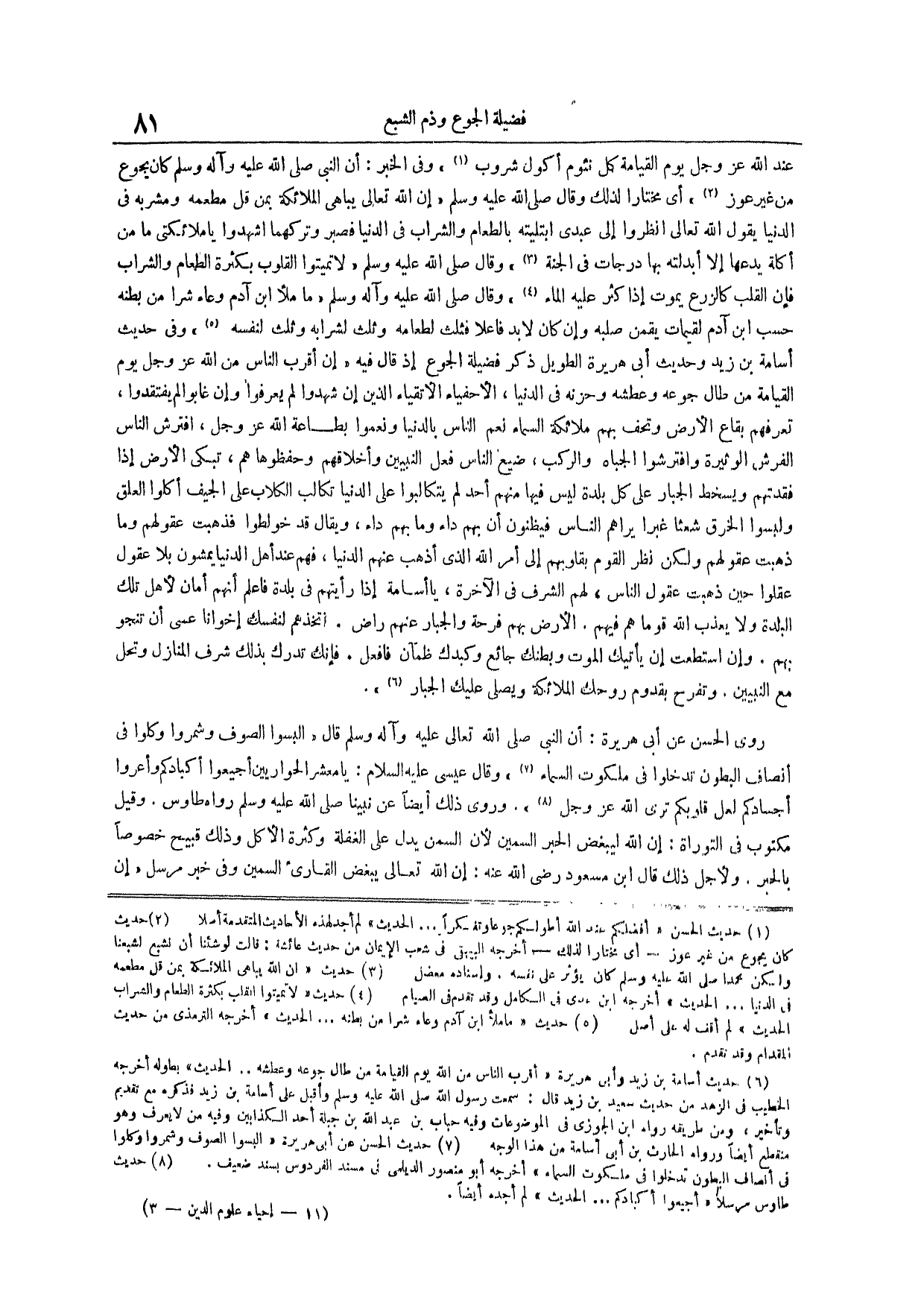 (¬3) حديث أن الله يباهي الملائكة بمن قل مطعمه في الدنيا الحديث أخرجه ابن عدي في الكامل وقد تقدم في الصيام