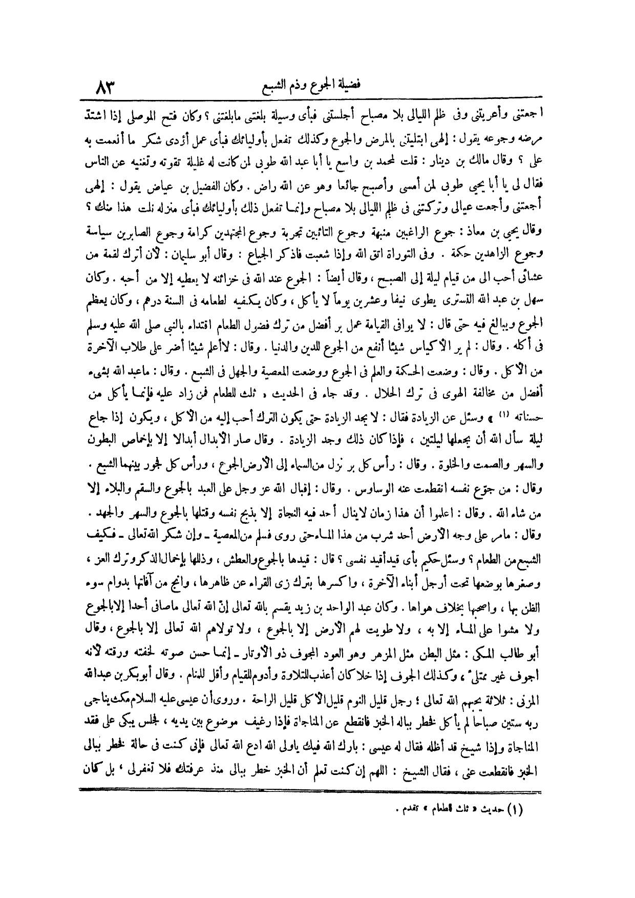 أجعتني وأعريتني وفي ظلم الليالي بلا مصباح أجلستني فبأي وسيلة بلغتني ما بلغتني وكان فتح الموصلي إذا اشتد مرضه وجوعه يقول إلهي ابتليتني بالمرض والجوع وكذلك تفعل بأوليائك فبأي عمل أؤدي شكر ما أنعمت به علي وقال مالك بن دينار قلت لمحمد بن واسع يا أبا عبد الله طوبى لمن كانت له غليلة تقوته وتغنيه عن الناس فقال لي يا أبا يحيى طوبى لمن أمسى وأصبح جائعاً وهو عن الله راض وكان الفضيل بن عياض يقول إلهي أجعتني وأجعت عيالي وتركتني في ظلم الليالي بلا مصباح وإنما تفعل ذلك بأوليائك فبأي منزلة نلت هذا منك وقال يحيى بن معاذ جوع الراغبين منبهة وجوع التائبين تجربة وجوع المجتهدين كرامة وجوع الصابرين سياسة وجوع الزاهدين حكمة وفي التوراة اتق الله وإذا شبعت فاذكر الجياع وقال أبو سليمان لأن أترك لقمة من عشائي أحب إلي من قيام ليلة إلى الصبح وقال أيضاً الجوع عند الله في خزائنه لا يعطيه إلا من أحبه وكان سهل بن عبد الله التستري يطوي نيفاً وعشرين يوماً لا يأكل وكان يكفيه لطعامه في السنة درهم وكان يعظم الجوع ويبالغ فيه حتى قال لا يوافى القيامة عمل بر أفضل من ترك فضول الطعام اقتداء بالنبي صلى الله عليه وسلم في أكله وقال لم ير الأكياس شيئاً أنفع من الجوع للدين والدنيا وقال لا أعلم شيئاً أضر على طلاب الآخرة من الأكل وقال وضعت الحكمة والعلم في الجوع ووضعت المعصية والجهل في الشبع وقال ما عبد الله بشيء أفضل من مخالفة الهوى في ترك الحلال وقد جاء في الحديث ثلث للطعام فمن زاد عليه فإنما يأكل من حسناته (¬1) وسئل عن الزيادة فقال لا يجد الزيادة حتى يكون الترك أحب إليه من الأكل ويكون إذا جاع ليلة سأل الله أن يجعلها ليلتين فإذا كان ذلك وجد الزيادة وقال صار الأبدال أبدالاً إلا بإخماص البطون والسهر والصمت والخلوة وقال رأس كل بر نزل من السماء إلى الأرض الجوع ورأس كل فجور بينهما الشبع وقال من جوع نفسه انقطعت عنه الوساوس وقال إقبال الله عز وجل على العبد بالجوع والسقم والبلاء إلا من شاء الله وقال اعلموا أن هذا زمان لا ينال أحد فيه النجاة إلا بذبح نفسه وقتلها بالجوع والسهر والجهد وقال ما مر على وجه الأرض أحد شرب من هذا الماء حتى روي فسلم من المعصية وإن شكر الله تعالى فكيف الشبع من الطعام وسئل حكيم بأي قيد أقيد نفسي قال قيدها بالجوع والعطش وذللها بإخمال الذكر وترك العز وصغرها بوضعها تحت أرجل أبناء الآخرة واكسرها بترك زي القراء عن ظاهرها وانج من آفاتها بدوام سوء الظن بها واصحبها بخلاف هواها وكان عبد الواحد بن زيد يقسم بالله تعالى إن الله تعالى ما صافي أحداً إلا بالجوع ولا مشوا على الماء إلا به ولا طويت لهم الأرض إلا بالجوع ولا تولاهم الله تعالى إلا بالجوع وقال أبو طالب المكي مثل البطن مثل المزهر وهو العود المجوف ذو الأوتار إنما حسن صوته لخفته ورقته لأنه أجوف غير ممتلئ وكذلك الجوف إذا خلا كان أعذب للتلاوة وأدوم للقيام وأقل للمنام وقال أبو بكر بن عبد الله المزني ثلاثة يحبهم الله تعالى رجل قليل النوم قليل الأكل قليل الراحة وروي أن عيسى عليه السلام مكث يناجي ربه ستين صباحاً لم يأكل فخطر بباله الخبزفانقطع عن المناجاة فإذا رغيف موضوع بين يديه فجلس يبكي على فقد المناجاة وإذا شيخ قد أظله فقال له عيسى بارك الله فيك يا ولي الله ادع الله تعالى فإني كنت في حالة فخطر ببالي الخبز فانقطعت عني فقال الشيخ اللهم إن كنت تعلم أن الخبز خطر ببالي منذ عرفتك فلا تغفر لي بل كان