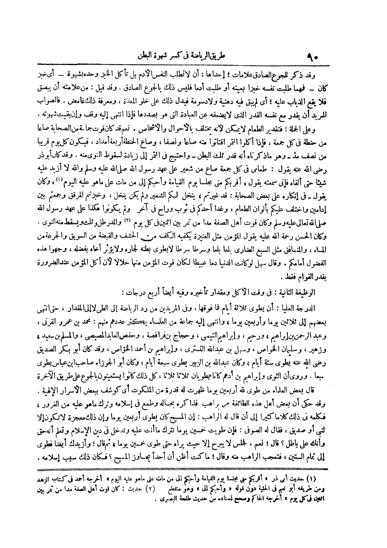 الدرجة العليا أن يطوي ثلاثة أيام فما فوقها وفي المريدين من رد الرياضة إلى الطي لا إلى المقدار حتى انتهى بعضهم إلى ثلاثين يوماً وأربعين يوماً وانتهى إليه جماعة من العلماء يكثر عددهم منهم محمد بن عمرو القرني وعبد الرحمن بن إبراهيم ورحيم وإبراهيم التيمي وحجاج بن فرافصة وحفص العابد المصيصي والمسلم بن سعيد وزهير وسليمان الخواص وسهل بن عبد الله التستري وإبراهيم بن أحمد الخواص وقد كان أبو بكر الصديق رضي الله عنه يطوي ستة أيام وكان عبد الله بن الزبير يطوي سبعة أيام وكان أبو الجوزاء صاحب ابن عباس يطوي سبعاً وروي أن الثوري وإبراهيم بن أدهم كانا يطويان ثلاثاً ثلاثاً كل ذلك كانوا يستعينون بالجوع على طريق الآخرة