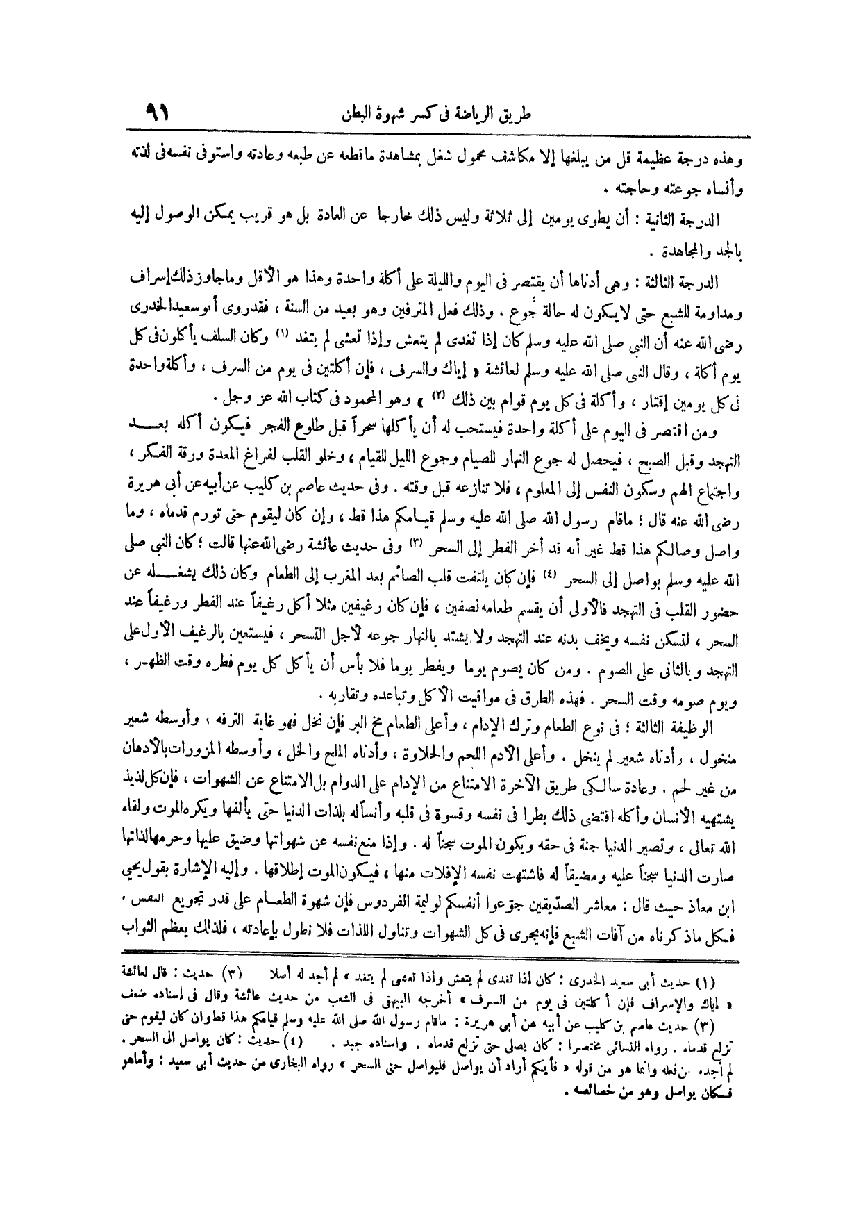 الدرجة الثالثة وهي أدناها أن يقتصر في اليوم والليلة على أكلة واحدة وهذا هو الأقل وما جاوز ذلك إسراف ومداومة للشبع حتى لا يكون له حالة جوع وذلك فعل المترفين وهو بعيد من السنة فقد روى أبو سعيد الخدري رضي الله عنه أن النبي صلى الله عليه وسلم كان إذا تغدى لم يتعش وإذا تعشى لم يتغد (¬1) وكان السلف يأكلون في كل يوم أكلة وقال النبي صلى الله عليه وسلم لعائشة إياك والسرف فإن أكلتين في يوم من السرف وأكلة واحدة في كل يومين إقتار وأكلة في كل يوم قوام بين ذلك (¬2) وهو المحمود في كتاب الله عز وجل ومن اقتصر في اليوم على أكلة واحدة فيستحب له أن يأكلها سحراً قبل طلوع الفجر فيكون أكله بعد التهجد وقبل الصبح فيحصل له جوع النهار للصيام وجوع الليل للقيام وخلو القلب لفراغ المعدة ورقة الفكر واجتماع الهم وسكون النفس إلى المعلوم فلا تنازعه قبل وقته وفي حديث عاصم بن كليب عن أبيه عن أبي هريرة رضي الله عنه قال ما قام رسول الله صلى الله عليه وسلم قيامكم هذا قط وإن كان ليقوم حتى تورم قدماه وما واصل وصالكم هذا قط غير أنه قد أخر الفطر إلى السحر (¬3) حديث كان يواصل إلى السحر لم أجده من فعله وإنما هو من قوله فأيكم أراد أن يواصل فليواصل حتى السحر رواه البخاري من حديث أبي سعيد وأما هو فكان يواصل وهو من خصائصه // فإن كان يلتفت قلب الصائم بعد المغرب إلى الطعام وكان ذلك يشغله عن حضور القلب في التهجد فالأولى أن يقسم طعامه نصفين فإن كان رغيفين مثلاً أكل رغيفاً عند الفطر ورغيفاً عند السحر لتسكن نفسه ويخف بدنه عند التهجد ولا يشتد بالنهار جوعه لأجل التسحر فيستعين بالرغيف الأول على التهجد وبالثاني على الصوم ومن كان يصوم يوماً ويفطر يوماً فلا بأس أن يأكل كل يوم فطره وقت الظهر ويوم صومه وقت السحر فهذه الطرق في مواقيت الأكل وتباعده وتقاربه