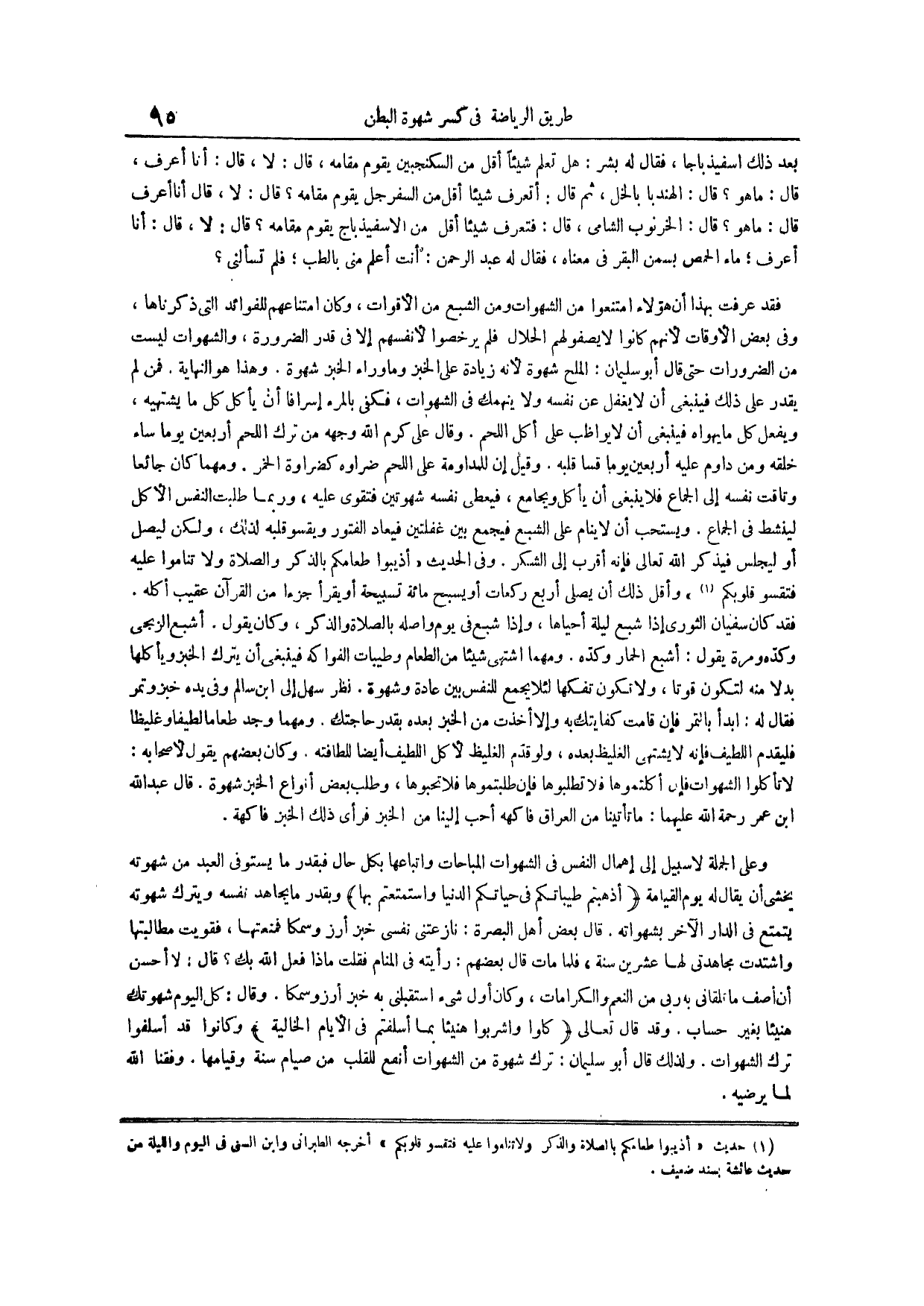 فقد عرفت بهذا أن هؤلاء امتنعوا من الشهوات ومن الشبع من الأقوات وكان امتناعهم للفوائد التي ذكرناها وفي بعض الأوقات لأنهم كانوا لا يصفو لهم الحلال فلم يرخصوا لأنفسهم إلا في قدر الضرورة والشهوات ليست من الضرورات حتى قال أبو سليمان الملح شهوة لأنه زيادة على الخبز وما وراء الخبز شهوة وهذا هو النهاية فمن لم يقدر على ذلك فينبغي أن لا يغفل عن نفسه ولا ينهمك في الشهوات فكفى بالمرء إسرافاً أن يأكل كل ما يشتهيه ويفعل كل ما يهواه فينبغي أن لا يواظب على أكل اللحم وقال علي كرم الله وجهه من ترك اللحم أربعين يوماً ساء خلقه ومن داوم عليه أربعين يوماً قسا قلبه وقيل أن للمداومة على اللحم ضراوة كضراوة الخمر ومهما كان جائعاً وتاقت نفسه إلى الجماع فلا ينبغي أن يأكل ويجامع فيعطي نفسه شهوتين فتقوى عليه وربما طلبت النفس الأكل لينشط في الجماع ويستحب أن لا ينام على الشبع فيجمع بين غفلتين فيعاد الفتور ويقسو قلبه لذلك ولكن ليصل أو ليجلس فيذكر الله تعالى فإنه أقرب إلى الشكر وفي الحديث أذيبوا طعامكم بالذكر والصلاة ولا تناموا عليه فتقسو قلوبكم (¬1) وأقل ذلك أن يصلي أربع ركعات أو يسبح مائة تسبيحة أو يقرأ جزءاً من القرآن عقيب أكله فقد كان سفيان الثوري إذا شبع ليلة أحياها وإذا شبع في يوم واصله بالصلاة والذكر وكان يقول أشبع الزنجي وكده ومرة يقول أشبع الحمار وكده ومهما اشتهى شيئاً من الطعام وطيبات الفواكه فينبغي أن يترك الخبز ويأكلها بدلاً منه لتكون قوتاً ولا تكون تفكها لئلا يجمع للنفس بين عادة وشهوة نظر سهل إلى ابن سالم وفي يده خبز وتمر فقال له ابدأ بالتمر فإن قامت كفايتك به وإلا أخذت من الخبز بعده بقدر حاجتك ومهما وجد طعاماً لطيفاً وغليظاً فليقدم اللطيف فإنه لا يشتهي الغليظ بعده ولو قدم الغليظ لأكل اللطيف أيضاً للطافته وكان بعضهم يقول لأصحابه لا تأكلوا الشهوات فإن أكلتموها فلا تطلبوها فإن طلبتموها فلا تحبوها وطلب بعض أنواع الخبز شهوة قال عبد الله ابن عمر رحمة الله عليهما ما تأتينا من العراق فاكهة أحب إلينا من الخبز فرأى ذلك الخبز فاكهة