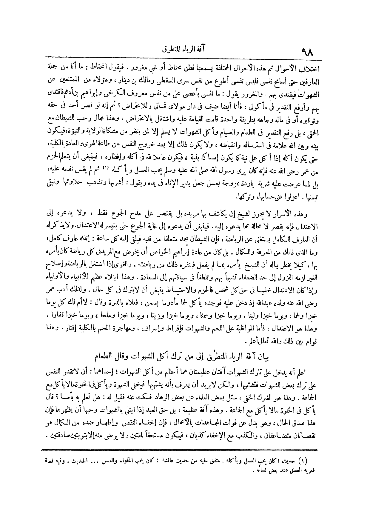 اختلاف الأحوال ثم هذه الأحوال المختلفة يسمعها فطن محتاط أو غبي مغرور فيقول المحتاط ما أنا من جملة العارفين حتى أسامح نفسي فليس نفسي أطوع من نفس سري السقطي ومالك بن دينار وهؤلاء من الممتنعين عن الشهوات فيقتدى بهم والمغرور يقول ما نفسي بأعصى علي من نفس معروف الكرخي وإبراهيم بن أدهم فاقتدى بهم وأرفع التقدير في مأكولي فأنا أيضاً ضيف في دار مولاي فمالي وللاعتراض ثم إنه لو قصر أحد في حقه وتوقيره أو في ماله وجاهه بطريقة واحدة قامت القيامة عليه واشتغل بالاعتراض وهذا مجال رحب للشيطان مع الحمقى بل رفع التقدير في الطعام والصيام وأكل الشهوات لا يسلم إلا لمن ينظر من مشكاة الولاية والنبوة فيكون بينه وبين الله علامة في استرساله وانقباضه ولا يكون ذلك إلا بعد خروج النفس عن طاعة الهوى والعادة بالكلية حتى يكون أكله إذا أكل على نية كما يكون إمساكه بنية فيكون عاملاً لله في أكله وإفطاره فينبغي أن يتعلم الحزم من عمر رضي الله عنه فإنه كان يرى رسول الله صلى الله عليه وسلم يحب العسل ويأكله // حديث كان يحب العسل ويأكله متفق عليه من حديث عائشة كان يحب الحلواء والعسل الحديث وفيه قصة شربه العسل عند بعض نسائه ثم لم يقس نفسه عليه بل لما عرضت عليه شربة باردة ممزوجة بعسل جعل يدير الإناء في يده ويقول أشربها وتذهب حلاوتها وتبقى تبعتها اعزلوا عني حسابها وتركها