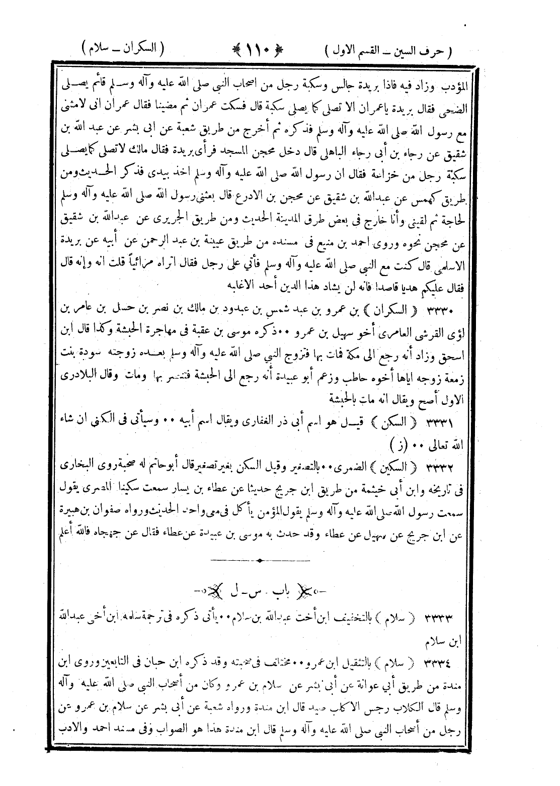 <110> المؤدب وزاد فيه فإذا بريدة جالس وسكبه رجل من أصحاب النبي صلى الله عليه وسلم قائم يصلي الضحى فقال بريدة يا عمران ألا تصلي كما يصلي سكبة قال فسكت عمران ثم مضينا فقال عمران إني لأمشي مع رسول الله صلى الله عليه وسلم فذكره ثم أخرج من طريق شعبة عن أبي بشر عن عبد الله بن شقيق عن رجاء بن أبي رجاء الباهلي قال دخل محجن المسجد فرأى بريدة فقال مالك لا تصلي كما يصلي سكبة رجل من خزاعة فقال إن رسول الله صلى الله عليه وسلم أخذ بيدي فذكر الحديث ومن طريق كهمس عن عبد الله بن شقيق عن محجن بن الأدرع قال بعثني رسول الله صلى الله عليه وسلم لحاجة ثم لقيني وأنا خارج في بعض طرق المدينة الحديث ومن طريق الجريري عن عبد الله بن شقيق عن محجن نحوه وروى أحمد بن منيع في مسنده من طريق عيينة بن عبد الرحمن عن أبيه عن بريدة الأسلمي قال كنت مع النبي صلى الله عليه وسلم فأتى علي رجل فقال أتراه مرائيا قلت إنه وإنه قال فقال عليكم هديا قاصدا فإنه لن يشاد هذا الدين أحد إلا غلبه السكران بن عمرو بن عبد شمس بن عبد ود بن مالك بن نصر بن حسل بن عامر بن لؤي القرشي العامري أخو سهيل بن عمرو ذكره موسى بن عقبة في مهاجرة الحبشة وكذا قال بن إسحاق وزاد أنه رجع إلى مكة فمات بها فتزوج النبي صلى الله عليه وسلم بعده زوجته سودة بنت زمعة زوجه إياها أخوه حاطب وزعم أبو عبيدة أنه رجع إلى الحبشة فتنصر بها ومات وقال البلاذري الأول أصح ويقال إنه مات بالحبشة السكن قيل هو اسم أبي ذر الغفاري ويقال اسم أبيه وسيأتي في الكنى إن شاء الله تعالى السكين الضمري بالتصغير وقيل السكن بغير تصغير قال أبو حاتم له صحبة روى البخاري في تاريخه وابن أبي خيثمة من طريق بن جريج حديثا عن عطاء بن يسار سمعت سكينا المصري يقول سمعت رسول الله صلى الله عليه وسلم يقول المؤمن يأكل في معي واحد الحديث رواه صفوان بن هبيرة عن بن جريج عن سهيل عن عطاء وقد حدث به موسى بن عبيدة عن عطاء فقال عن جهجاه فالله أعلم السين بعدها اللام سلام بالتخفيف بن أخت عبد الله بن سلام يأتي ذكره في ترجمة سلمة بن أخي عبد الله بن سلام سلام بالتثقيل بن عمرو مختلف في صحبته وقد ذكره بن حبان في التابعين وروى بن منده من طريق أبي عوانة عن أبي بشر عن سلام بن عمرو وكان من أصحاب النبي صلى الله عليه وسلم قال الكلاب رجس إلا كلب صيد قال بن منده ورواه شعبة عن أبي بشر عن سلام بن عمرو عن رجل من أصحاب النبي صلى الله عليه وسلم قال بن منده هذا هو الصواب وفي مسند أحمد والأدب §