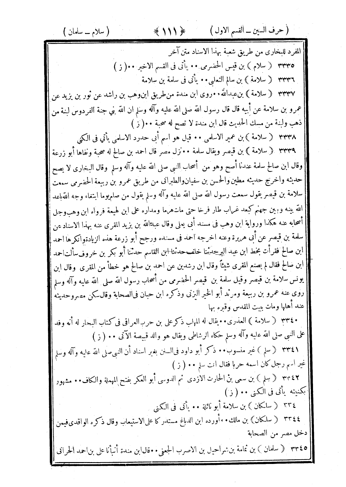 <111> المفرد للبخاري من طريق شعبة بهذا الإسناد متن آخر سلامة بن قيصر الحضرمي يأتي في القسم الأخير سلامة بن سلم الثعلبي يأتي في سلمة بن سلامة سلامة بن عبد الله روى بن منده من طريق وهب بن راشد عن ثور بن يزيد عن عمرو بن سلامة عن أبيه قال قال رسول الله صلى الله عليه وسلم إن الله بنى جنة الفردوس لبنة من ذهب ولبنة من مسك الحديث قال بن منده لا تصح له صحبة سلامة بن عمير الأسلمي قيل هو اسم أبي حدرد الأسلمي يأتي في الكنى سلامة بن قيصر ويقال سلمة نزل مصر قال أحمد بن صالح له صحبة ونفاها أبو زرعة وقال بن صالح سلمة عندنا أصح وهو من أصحاب النبي صلى الله عليه وسلم وقال البخاري لا يصح حديثه وأخرج حديثه مطين والحسن بن سفيان والطبراني من طريق عمرو بن ربيعة الحضرمي سمعت سلامة بن قيصر يقول سمعت رسول الله صلى الله عليه وسلم يقول من صام يوما ابتغاء وجه الله باعد الله بينه وبين جهنم كبعد غراب طار فرخا حتى مات هرما ومداره على بن لهيعة فرواه بن وهب وجل أصحابه عنه هكذا ورواية بن وهب في مسنده أبي يعلى وقال عبد الله بن يزيد المقرئ عنه بهذا الإسناد عن سلمة بن قيصر عن أبي هريرة وعنه أخرجه أحمد في مسنده ورجح أبو زرعة هذه الزيادة وأنكرها أحمد بن صالح فقرأت بخط بن عبد البر حدثنا خلف بن القاسم حدثنا أبو بكر بن خروف سألت أحمد بن صالح فقال لم يصنع المقرىء شيئا وقال بن رشدين عن أحمد بن صالح هو خطأ من المقرئ وقال بن يونس سلامة بن قيصر وقيل سلمة بن قيصر الحضرمي من أصحاب رسول الله صلى الله عليه وسلم وروى عنه عمرو بن ربيعة ومرثد أبو الخير اليزني وذكره بن حبان في الصحابة وقال سكن مصر وحديثه عند أهلها ومات ببيت المقدس وقبره بها سلامة العذري يقال له المهلب ذكره علي بن حرب العراقي في كتاب البحار له أنه وفد على النبي صلى الله عليه وسلم حكاه الرشاطي ويقال هو والد قبيصة الآتي سلم غير منسوب ذكر أبو داود في السنن بغير إسناد أن النبي صلى الله عليه وسلم غير اسم رجل كان اسمه حربا فقال له أنت سلم سلم بن سمي بن الحارث الأزدي ثم الدوسي أبو العكر بفتح المهملة والكاف مشهور بكنيته يأتي في الكنى سلكان بن سلامة أبو نائلة يأتي في الكنى سلكان بن مالك أورده بن الدباغ مستدركا على الأستيعاب وقال ذكره الواقدي فيمن دخل مصر من الصحابة سلمان بن ثمامة بن شراحيل بن الأصهب الجعفي قال بن منده أنبأنا علي بن أحمد الحراني §