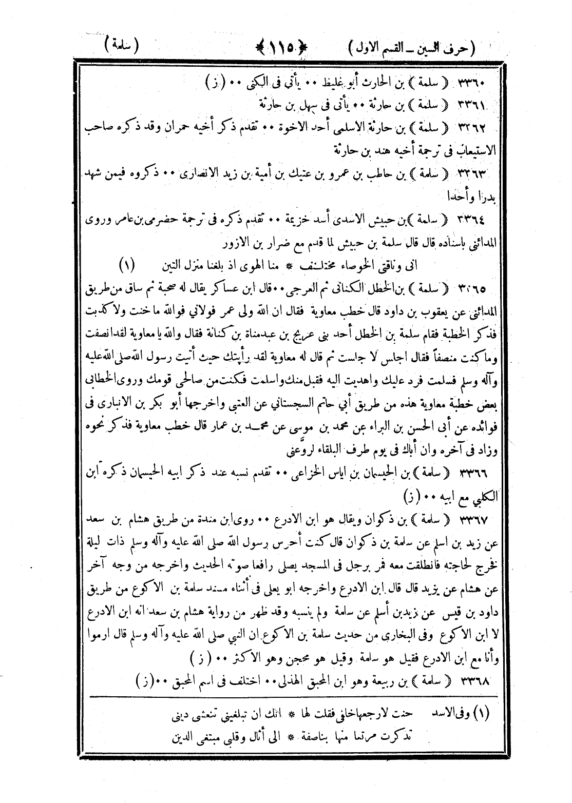 <115> سلمة بن الحارث أبو غليظ يأتي في الكنى سلمة بن حارثة يأتي في سهل بن حارثة سلمة بن حارثة الأسلمي أحد الإخوة تقدم ذكر أخيه حمران وقد ذكره صاحب الأستيعاب في ترجمة أخيه هند بن حارثة سلمة بن حاطب بن عمرو بن عتيك بن أمية بن زيد الأنصاري ذكروه فيمن شهد بدرا وأحدا سلمة بن حبيش الأسدي أسد خزيمة تقدم ذكره في ترجمة حضرمي بن عامر وروى المدائني بإسناده قال قال سلمة بن حبيش لما قدم مع ضرار بن الأزور إني وناقتي الخوصاء مختلف منا الهوى إذ بلغنا منزل التين سلمة بن الخطل الكناني ثم العرجي قال بن عساكر يقال له صحبة ثم ساق من طريق المدائني عن يعقوب بن داود قال خطب معاوية فقال إن الله ولي عمر فولاني فوالله ما خنت ولا كذبت فذكر الخطبة فقام سلمة بن الخطل أحد بني عريج بن عبد مناة بن كنانة فقال والله يا معاوية لقد أنصفت وما كنت منصفا فقال أجلس لأجلست ثم قال له معاوية لقد رأيتك حيث أتيت رسول الله صلى الله عليه وسلم فسلمت فرد عليك وأهديت إليه فقبل منك وأسلمت فكنت من صالحي قومك وروى الخطابي بعض خطبة معاوية هذه من طريق أبي حاتم السجستاني عن العتبي وأخرجها أبو بكر بن الأنباري في فوائده عن أبي الحسن بن البراء عن محمد بن موسى عن محمد بن عمارة قال خطب معاوية فذكر نحوه وزاد في آخره وإن أباك في يوم طرف البلقاء لذو غناء سلمة بن الحيسمان بن إياس الخزاعي تقدم نسبه عند ذكر أبيه الحيسمان ذكره بن الكلبي مع أبيه سلمة بن ذكوان ويقال هو بن الأدرع روى بن منده من طريق هشام بن سعد عن زيد بن أسلم عن سلمة بن ذكوان قال كنت أحرس رسول الله صلى الله عليه وسلم ذات ليلة فخرج لحاجته فانطلقت معه فمر برجل في المسجد يصلي رافعا صوته الحديث وأخرجه من وجه آخر عن هشام عن زيد قال قال بن الأدرع وأخرجه أبو يعلى في أثناء مسند سلمة بن الأكوع من طريق داود بن قيس عن زيد بن أسلم عن سلمة ولم ينسبه وقد ظهر من رواية هشام بن سعد أنه بن الأدرع لا بن الأكوع وفي البخاري من حديث سلمة بن الأكوع أن النبي صلى الله عليه وسلم قال ارموا وأنا مع بن الأدرع فقيل هو سلمة وقيل هو محجن وهو الأكثر سلمة بن ربيعة وهو بن المحبق الهذلي اختلف في اسم المحبق §