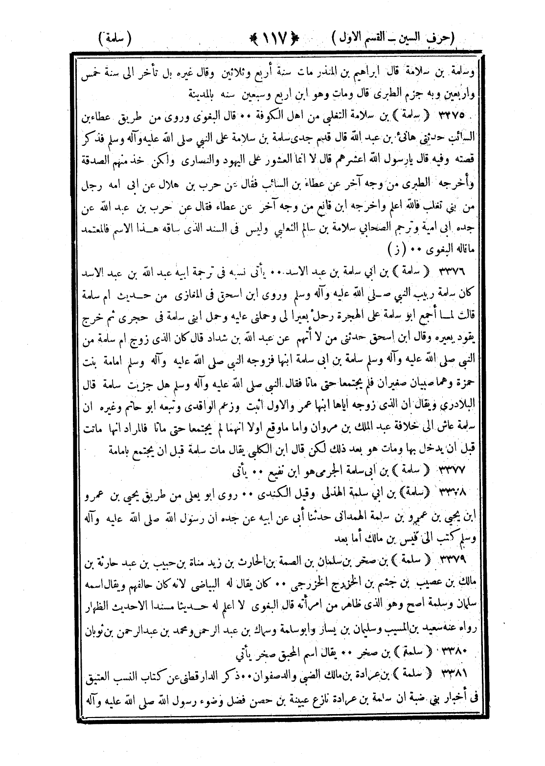 <117> وسلمة بن سلامة قال إبراهيم بن المنذر مات سنة أربع وثلاثين وقال غيره بل تأخر إلى سنة خمس وأربعين وبه جزم الطبري قال ومات وهو بن أربع وسبعين سنة بالمدينة سلمة بن سلامة الثعلبي من أهل الكوفة قال البغوي وروى من طريق عطاء بن السائب حدثني هانئ بن عبد الله قال قدم جدي سلمة بن سلامة على النبي صلى الله عليه وسلم فذكر قصته وفيه قال يا رسول الله أعشرهم قال لا إنما العشور على اليهود والنصارى ولكن خذ منهم الصدقة وأخرجه الطبري من وجه آخر عن عطاء بن السائب فقال عن حرب بن هلال عن أبي أمه رجل من بني ثعلب فالله أعلم وأخرجه بن قانع من وجه آخر عن عطاء فقال عن حرب بن عبد الله عن جده أبي أمه وترجم للصحابي سلامة بن سالم الثعلبي وليس في السند الذي ساقه هذا الاسم فالمعتمد ما قاله البغوي سلمة بن أبي سلمة بن عبد الأسد يأتي نسبه في ترجمة أبيه عبد الله بن عبد الأسد كان سلمة ربيب النبي صلى الله عليه وسلم وروى بن إسحاق في المغازي من حديث أم سلمة قالت لما أجمع أبو سلمة على الهجرة رحل بعيرا لي وحملني عليه وحمل ابني سلمة في حجري ثم خرج يقود بعيره وقال بن إسحاق حدثني من لا أتهم عن عبد الله بن شداد قال كان الذي زوج أم سلمة من النبي صلى الله عليه وسلم سلمة بن أبي سلمة ابنها فزوجه النبي صلى الله عليه وسلم أمامة بنت حمزة وهما صبيان صغيران فلم يجتمعا حتى ماتا فقال النبي صلى الله عليه وسلم هل جزيت سلمة قال البلاذري ويقال إن الذي زوجه إياها ابنها عمر والأول أثبت وزعم الواقدي وتبعه أبو حاتم وغيره أن سلمة عاش خلافة عبد الله بن مروان وأما ما وقع أولا أنهما لم يجتمعا حتى ماتا فالمراد أنها ماتت قبل أن يدخل بها ومات هو بعد ذلك لكن قال بن الكلبي يقال مات سلمة قبل أن يجتمع بأمامة سلمة بن أبي سلمة الجرمي هو بن نفيع يأتي سلمة بن أبي سلمة الهذلي وقيل الكندي روى أبو يعلى من طريق يحيى بن عمرو بن يحيى بن عمرو بن سلمة الهمداني حدثنا أبي عن أبيه عن جده أن رسول الله صلى الله عليه وسلم كتب إلى قيس بن مالك أما بعد سلمة بن صخر بن سلمان بن الصمة بن الحارث بن زيد مناة بن حبيب بن عبد حارثة بن مالك بن عضب بن جشم بن الخزرج الخزرجي كان يقال له البياضي لأنه كان حالفهم ويقال اسمه سلمان وسلمة أصح وهو الذي ظاهر من امرأته قال البغوي لا أعلم له حديثا مسندا إلا حديث الظهار رواه عنه سعيد بن المسيب وسليمان بن يسار وأبو سلمة وسماك بن عبد الرحمن ومحمد بن عبد الرحمن بن ثوبان سلمة بن صخر يقال اسم المحبق صخر يأتي سلمة بن عرادة بن مالك الضبي والد صفوان ذكر الدارقطني عن كتاب النسب العتيق في أخبار بني ضبة أن سلمة بن عرادة نازع عيينة بن حصن فضل وضوء رسول الله صلى الله عليه §