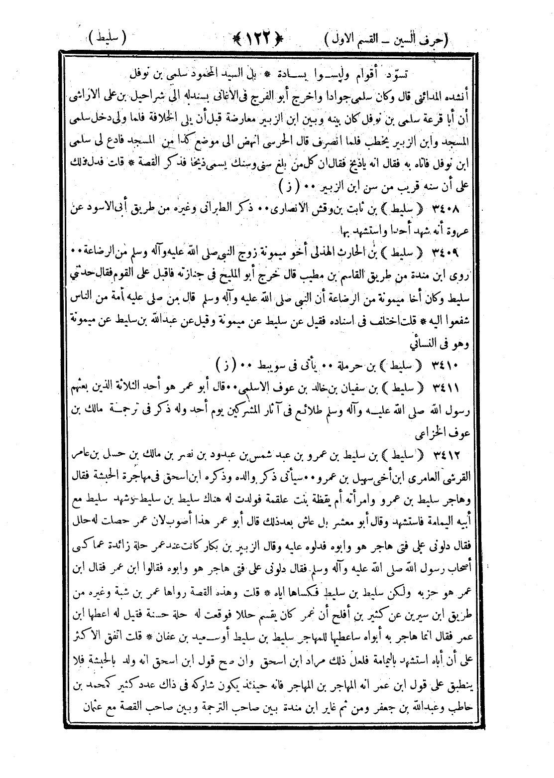 <122> تسود أقوام وليسوا بسادة بل السيد المحمود سلمى بن نوفل أنشده المدائني قال وكان سلمى جوادا وأخرج أبو الفرج في الاغاني بسند له إلى شراحيل بن على الأراشي أن أبا قزعة سلمى بن نوفل كان بينه وبين بن الزبير معارضة قبل أن بلى الخلافة فلما ولي دخل سلمى المسجد وابن الزبير يخطب فلما انصرف قال للحرس انهض إلى موضع كذا من المسجد فادع لي سلمى بن نوفل فأتاه به فقال أنه ياذيخ فقال إن كل من بلغ سني وسنك يسمى ذيخا فذكر القصة قلت فدل ذلك على أن سنه قريب من سن بن الزبير سليط بن ثابت بن وقش الأنصاري ذكر الطبراني وغيره من طريق أبي الأسود عن عروة أنه شهد أحدا واستشهد بها سليط بن الحارث الهلالي أخو ميمونة زوج النبي صلى الله عليه وسلم من الرضاعة روى بن منده من طريق القاسم بن مطيب قال خرج أبو المليح في جنازة فأقبل على القوم فقال حدثني سليط وكان أخو ميمونة من الرضاعة أن النبي صلى الله عليه وسلم قال من صلى عليه أمة من الناس شفعوا إليه قلت اختلف الناس في إسناده فقيل عن سليط عن ميمونة وقيل عن عبد الله بن سليك عن ميمونة وهو في النسائي سليط بن حرملة يأتي في سويبط سليط بن سفيان بن خالد بن عوف الأسلمي قال أبو عمر هو أحد الثلاثة الذين بعثهم رسول الله صلى الله عليه وسلم طلائع في آثار المشركين يوم أحد وله ذكر في ترجمة مالك بن عوف الخزاعي سليط بن سليط بن عمرو بن عبد شمس بن عبد ود بن نصر بن مالك بن حسل بن عامر القرشي العامري بن أخي سهيل بن عمرو سيأتي ذكر والده وذكره بن إسحاق في مهاجرة الحبشة فقال وهاجر سليط بن عمرو وامرأته أم يقظة بنت علقمة فولدت له هناك سليط بن سليط وشهد سليط مع أبيه اليمامة فاستشهد وقال أبو معشر بل عاش بعد ذلك قال أبو عمر هذا أصوب لأن عمر حصلت له حلل فقال دلوني على فتى هاجر هو وأبوه فدلوه عليه وقال الزبير بن بكار كانت عند عمر حلة زائدة عما كسا أصحاب رسول الله صلى الله عليه وسلم فقال دلوني على فتى هاجر هو وأبوه فقالوا بن عمر فقال بن عمر هوجر به ولكن سليط بن سليط فكساه إياها قلت وهذه القصة رواها عمر بن شبة وغيره من طريق بن سيرين عن كثير بن أفلح أن عمر كان يقسم حللا فوقعت له حلة حسنة فقيل له أعطها بن عمر فقال إنما هاجر به أبواه سأعطيها للمهاجر بن المهاجر سليط بن سليط أو سعيد بن عتاب قلت اتفق الأكثر على أن أباه استشهد باليمامة فلعل ذلك مراد بن إسحاق وإن صح قول بن إسحاق إنه ولد بالحبشة فلا ينطبق على قول عمر إنه لمهاجر بن المهاجر فإنه حينئذ يكون شاركه في ذاك عدد كثير كمحمد بن حاطب وعبد الله بن جعفر ومن ثم غاير بن منده بين صاحب الترجمة وبين صاحب القصة مع عمر §