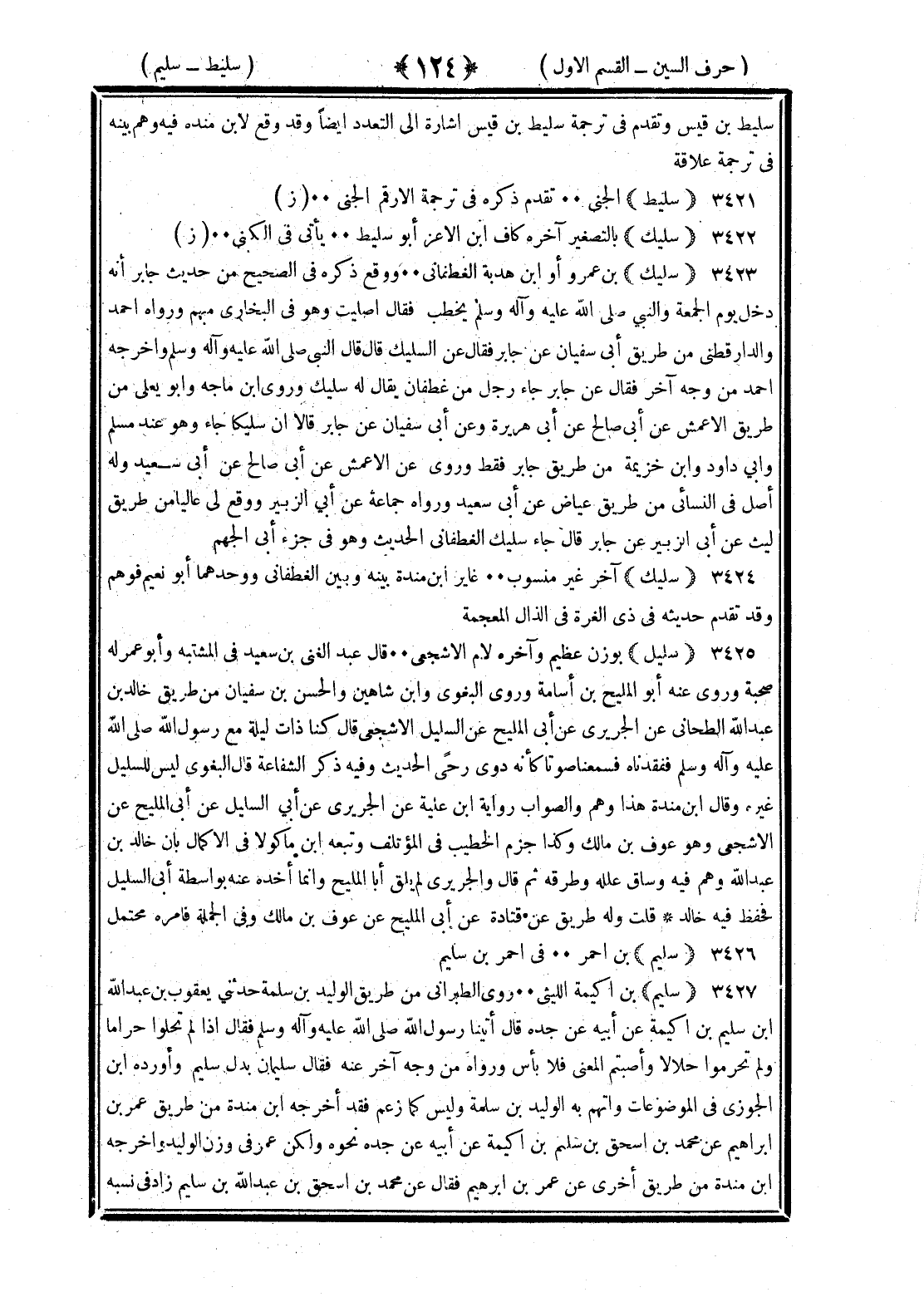 <124> سليط بن قيس وتقدم في ترجمة سليط بن قيس إشارة إلى التعدد أيضا وقد وقع لابن منده فيه وهم بينته في ترجمة علاقة سليط الجني تقدم ذكره في ترجمة الأرقم الجني سليك بالتصغير وآخره كاف بن الأغر أبو سليط يأتي في الكنى سليك بن عمرو أو بن هدبة الغطفاني ووقع ذكره في الصحيح من حديث جابر أنه دخل يوم الجمعة والنبي صلى الله عليه وسلم يخطب فقال أصليت وهو في البخاري مبهم ورواه أحمد والدارقطني من طريق أبي سفيان عن جابر فقال عن السليك قال قال النبي صلى الله عليه وسلم وأخرجه أحمد من وجه آخر فقال عن جابر جاء رجل من غطفان يقال له سليك روى بن ماجة وأبو يعلى من طريق الأعمش عن أبي صالح عن أبي هريرة وعن أبي سفيان عن جابر قالا إن سليكا جاء وهو عند مسلم وأبي داود وابن خزيمة من طريق جابر فقط وروى عن الأعمش عن أبي صالح عن أبي سعيد وله أصل في النسائي من طريق عياض عن أبي سعيد ورواه جماعة عن أبي الزبير ووقع لي عاليا من طريق ليث عن أبي الزبير عن جابر قال جاء سليك الغطفاني الحديث وهو جزء أبي الجهم سليك آخر غير منسوب غاير بن منده بينه وبين الغطفاني ووحدهما أبو نعيم فوهم وقد تقدم حديثه في ذي الغرة في الذال المعجمة سليل بوزن عظيم وآخره لام الأشجعي قال عبد الغني بن سعيد في المشتبه وأبو عمر له صحبة وروى عنه أبو المليح بن أسامة وروى البغوي وابن شاهين والحسن بن سفيان من طريق خالد بن عبد الله الطحان عن الجريري عن أبي المليح عن السليل الأشجعي قال كنا ذات ليلة مع رسول الله صلى الله عليه وسلم ففقدناه فسمعنا صوتا كأنه دوى رحا الحديث وفيه ذكر الشفاعة قال البغوي ليس للسليل غيره وقال بن منده هذا وهم والصواب رواية بن علية عن الجريري عن أبي السليل عن أبي المليح عن الأشجعي وهو عوف بن مالك وكذا جزم الخطيب في المؤتلف وتبعه بن ماكولا في الإكمال بأن خالد بن عبد الله وهم فيه وساق علله وطرقه ثم قال والجريري لم يلق أبا المليح وإنما أخذه عنه بواسطة أبي السليل فخبط فيه خالد قلت وله طريق عن قتادة عن أبي المليح عن عوف بن مالك وفي الجملة فأمره محتمل سليم بن أحمر في أحمر بن سليم سليم بن أكيمة الليثي روى الطبراني من طريق الوليد بن سلمة حدثني يعقوب بن عبد الله بن سليم بن أكيمة عن أبيه عن جده قال أتينا رسول الله صلى الله عليه وسلم فقال إذا لم تحلوا حراما ولم تحرموا حلال وأصبتم المعنى فلا بأس ورواه من وجه آخر عنه فقال سليمان بدل سليم وأورده بن الجوزي في الموضوعات واتهم به الوليد بن سلمة وليس كما زعم فقد أخرجه بن منده من طريق أخرى عن عمر بن إبراهيم عن محمد بن إسحاق بن أكيمة عن أبيه عن جده نحوه ولكن عمر في زمن الوليد وأخرجه بن منده من طريق أخرى عن عمر بن إبراهيم فقال عن محمد بن إسحاق بن عبد الله بن سليم زاد في نسبه §