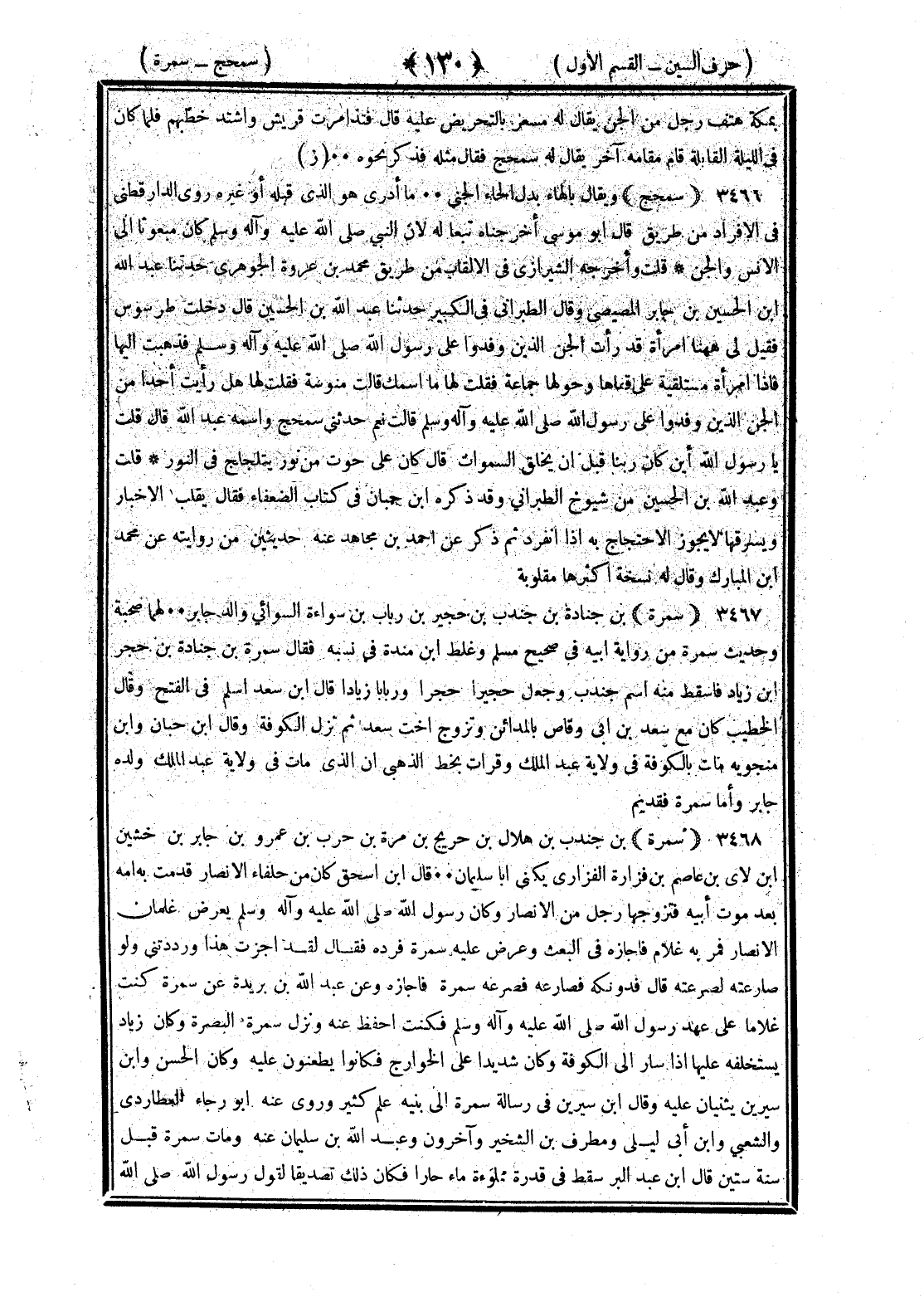 <130> بمكة هتف رجل من الجن يقال له مسعر بالتحريض عليه قال فتذامرت قريش واشتد خطبهم فلما كان في الليلة القابلة قام مقامه آخر يقال له سمحج فقال مثله فذكر نحوه سمحج ويقال بالهاء بدل الحاء الجني ما أدرى هو الذي قبله أو غيره روى الدارقطني في الأفراد من طريق قال أبو موسى أخرجناه تبعا له لأن النبي صلى الله عليه وسلم كان مبعوثا إلى الإنس والجن قلت وأخرجه الشيرازي في الألقاب من طريق محمد بن عروة الجوهري حدثنا عبد الله بن الحسين بن جابر المصيصي ح وقال الطبراني في الكبير حدثنا عبد الله بن الحسين قال دخلت طرسوس فقيل لي ها هنا امرأة قد رأت الجن الذي وفدوا على رسول الله صلى الله عليه وسلم فذهبت إليها فإذا امرأة مستلقية على قفاها وحولها جماعة فقلت لها ما اسمك قالت منوسة فقلت لها هل رأيت أحدا من الجن الذين وفدوا على رسول الله صلى الله عليه وسلم قالت نعم حدثني سمحج واسمه عبد الله قال قلت يا رسول الله أين كان ربنا قبل أن يخلق السماوات والأرض قال كان على حوت من نور يتلجلج في النور قلت وعبد الله بن الحسين من شيوخ الطبراني وقد ذكره بن حبان في كتاب الضعفاء فقال يقلب الأخبار ويسرقها لا يجوز الاحتجاج به إذا نفرد ثم ذكر عن أحمد بن مجاهد عنه حديثين من روايته عن محمد بن المبارك وقال له نسخة أكثرها مقلوبة سمرة بن جنادة بن جندب بن حجير بن زباب بن سواءة السوائي والد جابر لهما صحبة وحديث سمره من رواية أبيه في صحيح مسلم وغلط بن منده في نسبه فقال سمرة بن جنادة بن حجر بن زياد فأسقط منه اسم جندب وجعل حجيرا حجرا وزبابا زيادا قال بن سعد أسلم في الفتح وقال الخطيب كان مع سعد بن أبي وقاص بالمدائن وتزوج أخت سعد ثم نزل بالكوفة وقال بن حبان وابن منجويه مات بالكوفة في ولاية عبد الملك وقرأت بخط الذهبي أن الذي مات في ولاية عبد الملك ولده جابر وأما سمرة فقديم سمرة بن جندب بن هلال بن حريج بن مرة بن حزن بن عمرو بن جابر بن خشين بن لأي بن عصيم بن فزارة الفزاري يكنى أبا سليمان قال بن إسحاق كان من حلفاء الأنصار قدمت به أمه بعد موت أبيه فتزوجها رجل من الأنصار وكان رسول الله صلى الله عليه وسلم يعرض غلمان الأنصار فمر به غلام فأجازه في البعث وعرض عليه سمرة فرده فقال لقد أجزت هذا ورددتني ولو صارعته لصرعته قال فدونكه فصارعه فصرعه سمرة فأجازه وعن عبد الله بن بريده عن سمرة كنت غلاما على عهد رسول الله صلى الله عليه وسلم فكنت أحفظ عنه ونزل سمرة البصرة وكان زياد يستخلفه عليها إذا سار إلى الكوفة وكان شديدا على الخوارج فكانوا يطعنون عليه وكان الحسن وابن سيرين يثنيان عليه وقال بن سيرين في رسالة سمرة إلى بنية علم كثير وروى عنه أبو رجاء العطاردي والشعبي وابن أبي ليلى وطرف بن الشخير وآخرون وعبد الله بن سليمان عنه ومات سمرة قبل سنة ستين قال بن عبد البر سقط في قدر مملوء ماء حارا فكان ذلك تصديقا لقول رسول الله صلى الله §