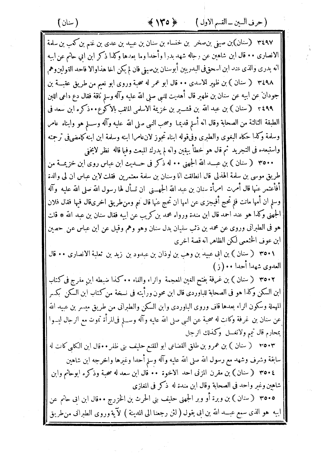 <135> سنان بن صيفي بن صخر بن خنساء بن سنان بن عبيد بن عدي بن غنم بن كعب بن سلمة الأنصاري قال بن شاهين عن رجاله شهد بدرا وأحدا وما بعدها وكذا ذكر بن أبي حاتم عن أبيه أنه بدري والذي عند بن إسحاق في البدريين أبو سنان بن صيفي فإن لم يكن أخا هذا وإلا فأحد القولين وهم سنان بن ظهير الأسدي قال أبو عمر له صحبة وروى أبو نعيم من طريق عقبة بن جودان عن أبيه عن سنان بن ظهير قال أهديت للنبي صلى الله عليه وسلم ناقة فقال دع داعي اللبن سنان بن عبد الله بن قشير بن خزيمة الأسلمي الملقب بالأكوع ذكره بن سعد في الطبقة الثالثة من الصحابة وقال أنه أسلم قديما وصحب النبي صلى الله عليه وسلم هو وابناه عامر وسلمة وكذا حكاه البغوي والطبري وفي قوله ابناه تجوز لأن عامرا ابنه وسلمة بن ابنه كما مضى في ترجمته واستبعده في التجريد ثم قال هو خطأ بيقين وإنه لم يدركه المبعث وفيما قاله نظر لا يخفى سنان بن عبد الله الجهني له ذكر في حديث بن عباس روى بن خزيمة من طريق موسى بن سلمة الهذلي قال انطلقت أنا وسنان بن سلمة معتمرين فقلت لابن عباس أن لي والدة أفأعتمر عنها قال أمرت امرأة سنان بن عبد الله الجهني أن يسأل لها رسول الله صلى الله عليه وسلم أن أمها ماتت فلم تحج أفيجزي عن أمها أن تحج عنها قال نعم ومن طريق أخرى قال فيها فقال فلان الجهني وكذا هو عند أحمد قال بن منده ورواه محمد بن كريب عن أبيه فقال سنان بن عبد الله قلت هو في الطبراني وروى عن محمد بن كريب سفيان بدل سنان وهو وهم وقيل عن بن عباس عن حصين بن عوف الخثعمي لكن الظاهر أنه قصة أخرى سنان بن أبي عبيد بن وهب بن لوذان بن عبد ود بن زيد بن ثعلبة الأنصاري قال العدوي شهد أحدا سنان بن غرفة بفتح الغين المعجمة والراء والفاء كذا ضبطه بن مفرج في كتاب بن السكن وكذا هو في الصحابة للباوردي قال بن فتحون ورأيته في نسخة من كتاب بن السكن بكسر المهملة وسكون الراء بعدها قاف وروى البارودي وابن السكن والطبراني من طريق بسر بن عبيد الله عن سنان بن غرفة وكانت له صحبة عن النبي صلى الله عليه وسلم في المرأة تموت مع الرجال ليسوا بمحارم قال تيمم ولاتغسل وكذلك الرجل سنان بن عمرو بن طلق القضاعي أبو المقنع حليف بني ظفر قال بن الكلبي كانت له سابقة وشرف وشهد مع رسول الله صلى الله عليه وسلم أحدا وغيرها وأخرجه بن شاهين سنان بن مقرن المزني أحد الإخوة قال بن سعد له صحبة وذكره أبو حاتم وابن شاهين وغير واحد في الصحابة وقال بن منده له ذكر في المغازي سنان بن وبرة أو وبر الجهني حليف بني الحارث بن الخزرج قال بن أبي حاتم عن أبيه هو الذي سمع عبد الله بن أبي يقول لئن رجعنا إلى المدينة الآية وروى الطبراني من طريق §