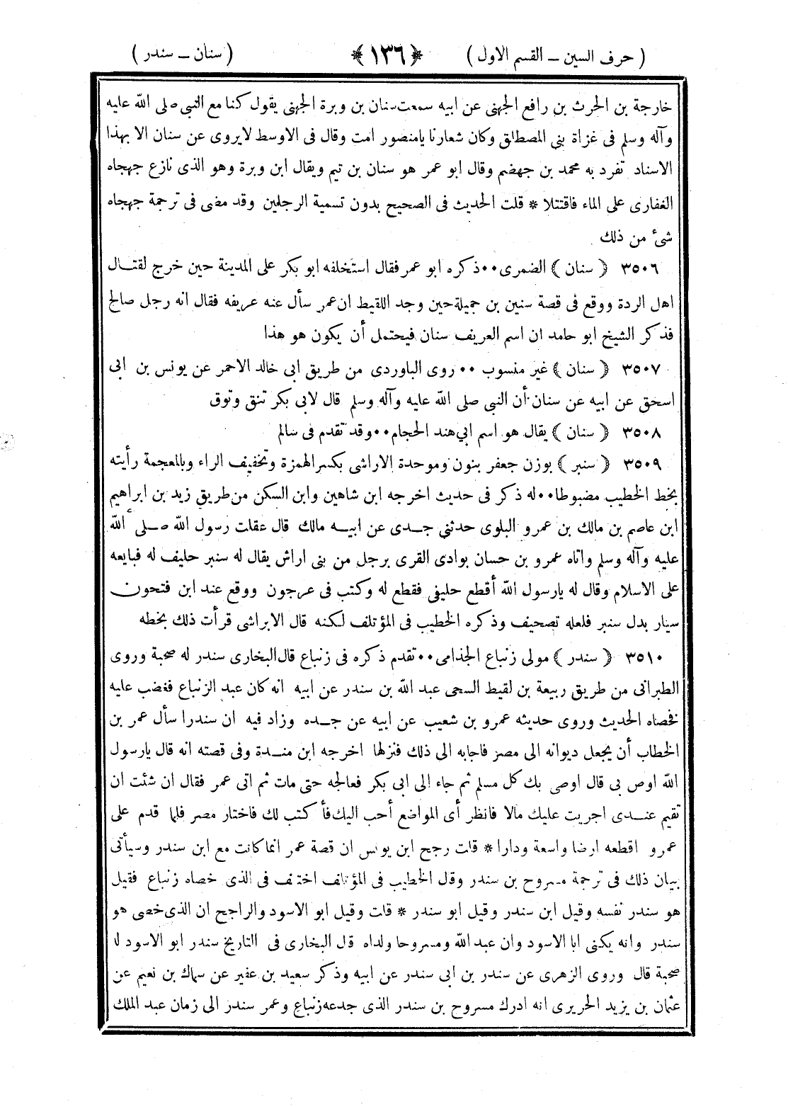 <136> خارجة بن الحارث بن رافع الجهني عن أبيه سمعت سنان بن وبرة الجهني يقول كنا مع النبي صلى الله عليه وسلم في غزاة بني المصطلق وكان شعارنا يا منصور أمت وقال في الأوسط لا يروي عن سنان إلا بهذا الإسناد تفرد به محمد بن جهضم وقال أبو عمر هو سنان بن تيم ويقال بن وبرة وهو الذي نازع جهجاه الغفاري على الماء فاقتتلا قلت الحديث في الصحيح بدون تسمية الرجلين وقد مضى في ترجمة جهجاه شيء من ذلك سنان الضمري ذكره أبو عمر فقال استخلفه أبو بكر على المدينة حين خرج لقتال أهل الردة ووقع في قصة سنين أبو جميلة حين وجد اللقيط أن عمر سأل عنه عريفه فقال أنه رجل صالح فذكر الشيخ أبو حامد أن اسم العريف سنان فيحتمل أن يكون هو هذا سنان غير منسوب روى الباوردي من طريق أبي خالد الأحمر عن يونس بن أبي إسحاق عن أبيه عن سنان أن النبي صلى الله عليه وسلم قال لأبي بكر تنق وتوق سنان يقال هو اسم أبي هند الحجام وقد تقدم في سالم سنبر بوزن جعفر بنون وموحدة الإراشي بكسر الهمزة وتخفيف الراء وبالمعجمة رأيته بخط الخطيب مضبوطا له ذكر في حديث أخرجه بن شاهين وابن السكن من طريق رشيد بن إبراهيم بن عاصم بن مالك بن عمرو البلوي حدثني جدي عن أبيه مالك قال عقلت النبي صلى الله عليه وسلم وأتاه عمرو بن حسان بوادي القرى برجل من بني إراش يقال له سنبر حليف له فبايعه على الإسلام وقال له يا رسول الله أقطع حليفي فقطع له وكتب له في عرجون ووقع عند بن فتحون سيار بدل سنبر فلعله تصحيف وذكره الخطيب في المؤتلف لكنه قال الأبواشي قرأت ذلك بخطه سندر مولى زنباع الجذامي تقدم ذكره في زنباع قال البخاري سندر له صحبة وروى الطبراني من طريق ربيعة بن لقيط التجيبي عبد الله بن سندر عن أبيه أنه كان عبدا لزنباع فغضب عليه فخصاه الحديث وروى حديثه عمرو بن شعيب عن أبيه عن جده وزاد فيه أن سندرا سأل عمر بن الخطاب أن يجعل ديوانه في مصر فأجابه إلى ذلك فنزلها أخرجه بن منده وفي قصته أنه قال يا رسول الله أوص بي قال أوصي بك كل مسلم ثم جاء إلى أبي بكر فعاله حتى مات ثم أتى عمر فقال أن شئت أن تقيم عندي أجريت عليك ما لا فأنظر أي المواضع أحب إليك فاكتب لك فاختار مصر فلما قدم على عمرو أقطعه أرضا واسعة ودارا قلت رجح بن يونس أن قصة عمر إنما كانت مع بن سندر وسيأتي بيان ذلك في ترجمة مسروح بن سندر وقال الخطيب في المؤتلف اختلف في الذي خصاه زنباع فقيل هو سندر نفسه وقيل بن سندر وقيل أبو سندر قلت وقيل أبو الأسود والراجح أن الذي خصي هو سندر وأنه يكنى أبا الأسود وأن عبد الله ومسرحا ولداه وقال البخاري في التاريخ سندر أبو الأسود له صحبة قال وروى الزهري عن سندر عن أبيه وذكر سعيد بن عفير عن سماك بن نعيم عن عثمان بن سويد الجروي أنه أدرك مسروح بن سندر الذي جدعه زنباع وعمر سندر إلى زمان عبد الملك §