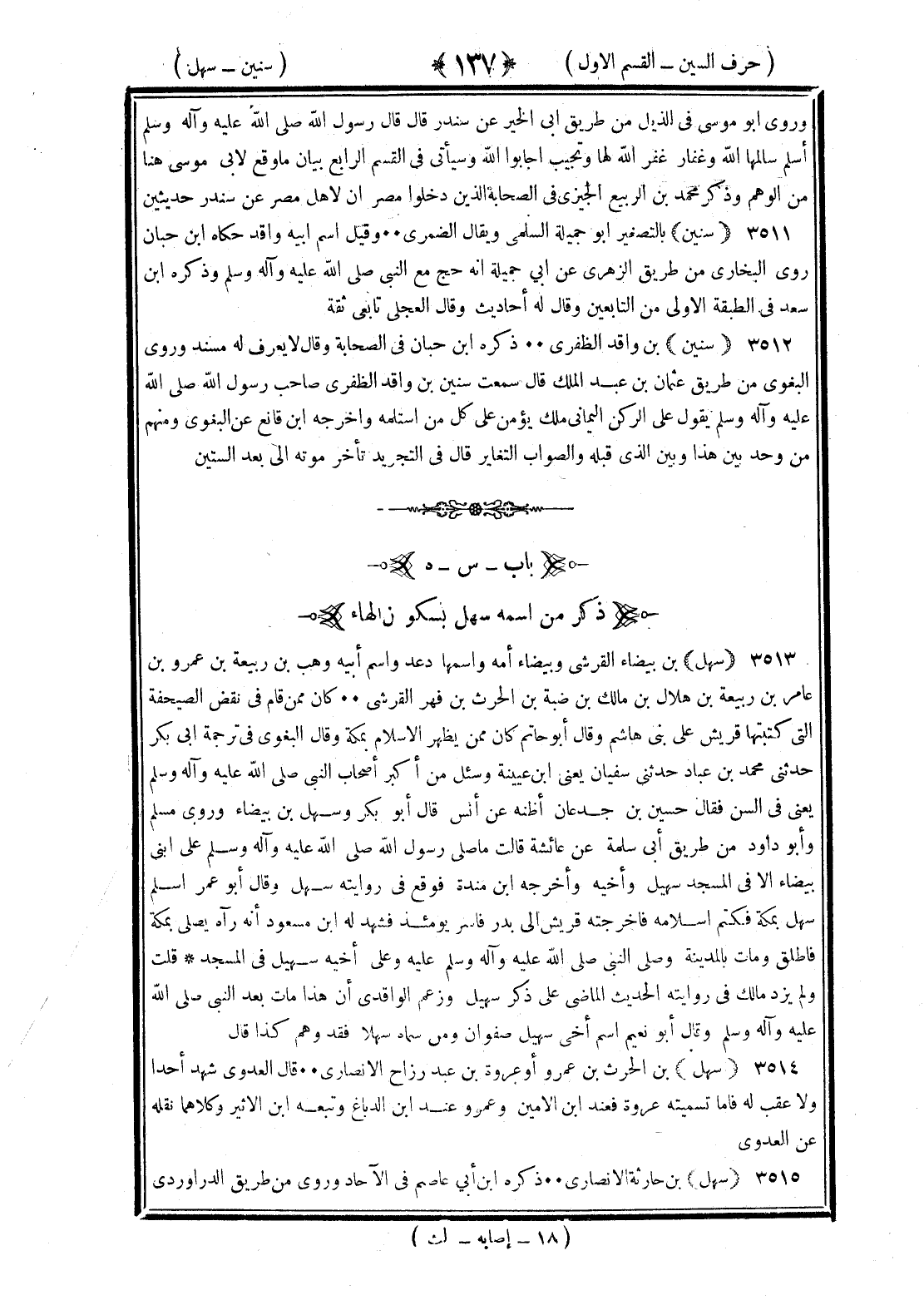 <137> وروى أبو موسى في الذيل من طريق أبي الخير عن سندر قال قال رسول الله صلى الله عليه وسلم أسلم سالمها الله وغفار غفر الله لها وتجيب أجابوا الله وسيأتي في القسم الرابع بيان ما وقع لأبي موسى هنا من الوهم وذكر محمد بن الربيع الجيزي في الصحابة الذين دخلوا مصر أن لأهل مصر عن سندر حديثين سنين بالتصغير أبو جميلة السلمي ويقال الضمري وقيل اسم أبيه واقد حكاه بن حبان روى البخاري من طريق الزهري عن أبي جميلة أنه حج مع النبي صلى الله عليه وسلم وذكره بن سعد في الطبقة الأولى من التابعين وقال له أحاديث وقال العجلي تابعي ثقة سنين بن واقد الظفري ذكره بن حبان في الصحابة وقال لا يعرف له مسند وروى البغوي من طريق عثمان بن عبد الملك قال سمعت سنين بن واقد الظفري صاحب رسول الله صلى الله عليه وسلم يقول على الركن اليماني ملك يؤمن على كل من استلمه أخرجه بن قانع عن البغوي ومنهم من وحد بين هذا وبين الذي قبله والصواب التغاير قال في التجريد تأخر موته إلى بعد الستين السين بعدها الهاء ذكر من اسمه سهل بسكون الهاء سهل بن بيضاء القرشي وبيضاء أمه واسمها دعد واسم أبيه وهب بن ربيعة بن عمرو بن عامر بن ربيعة بن هلال بن مالك بن ضبة بن الحارث بن فهر القرشي كان ممن قام في نقض الصحيفة التي كتبتها قريش على بني هاشم وقال أبو حاتم كان ممن يظهر الإسلام بمكة وقال البغوي في ترجمة أبي بكر حدثني محمد بن عباد حدثني سفيان يعني بن عيينة وسئل من أكبر أصحاب النبي صلى الله عليه وسلم يعني في السن فقال حسين بن جدعان أظنه عن أنس قال أبو بكر وسهل بن بيضاء روى مسلم وأبو داود من طريق أبي سلمة عن عائشة قالت ما صلى رسول الله صلى الله عليه وسلم على ابني بيضاء الا في المسجد سهيل وأخيه وأخرجه بن منده فوقع في روايته سهل وقال أبو عمر أسلم سهل بمكة فكتم إسلامه فأخرجته قريش إلى بدر فأسر يومئذا فشهد له بن مسعود أنه رآه يصلي بمكة فأطلق ومات بالمدينة وصلى النبي صلى الله عليه وسلم عليه وعلى أخيه سهيل في المسجد قلت ولم يزد مالك في روايته الحديث الماضي على ذكر سهيل وزعم الواقدي أن هذا مات بعد النبي صلى الله عليه وسلم وقال أبو نعيم اسم أخي سهيل صفوان ومن سماه سهلا فقد وهم كذا قال سهل بن الحارث بن عمرو أو عروة بن عبد رزاح الأنصاري قال العدوي شهد أحدا ولا عقب له فأما تسميته عروة فعند بن الأمين وعمرو عند بن الدباغ وتبعه بن الأثير وكلاهما نقله عن العدوي سهيل بن حارثة الأنصاري ذكره بن أبي عاصم في الآحاد وروى من طريق الدراوردي §